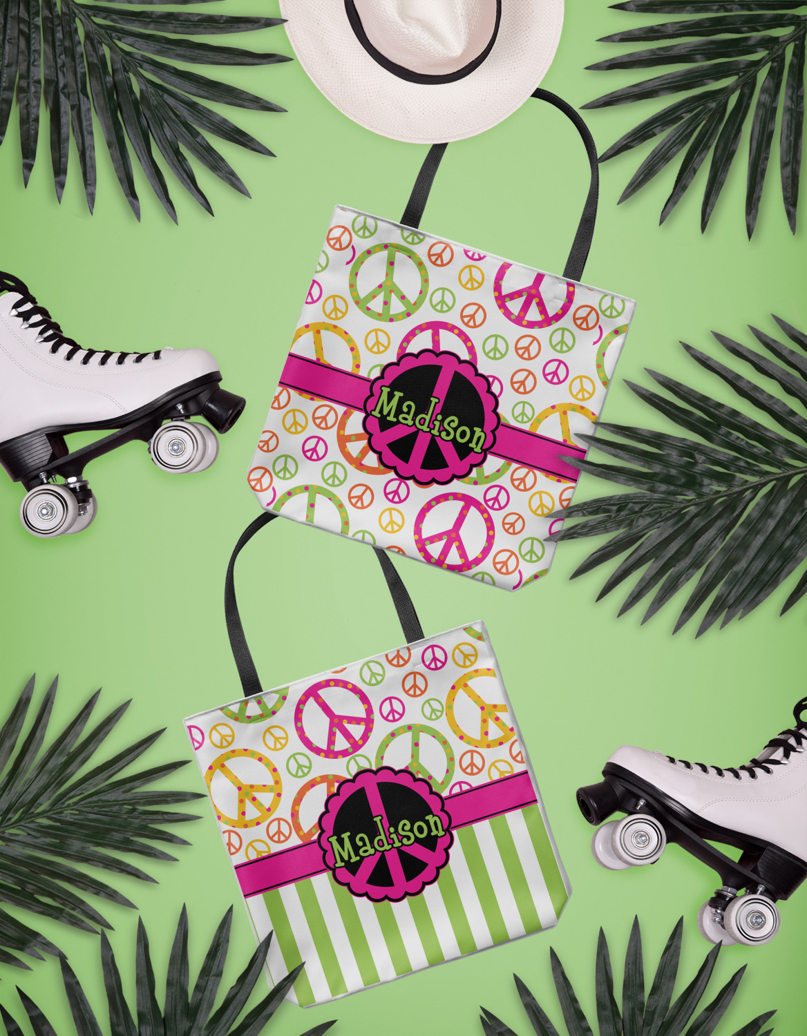 This design is totally groovy and will let the little hippie chick in you shine. Our peace sign design is simply adorable and has beautiful vibrant colors of pink, orange, lime green and yellow. The larger peace signs have fun polka dots and are surrounded by smaller solid colored peace signs.
