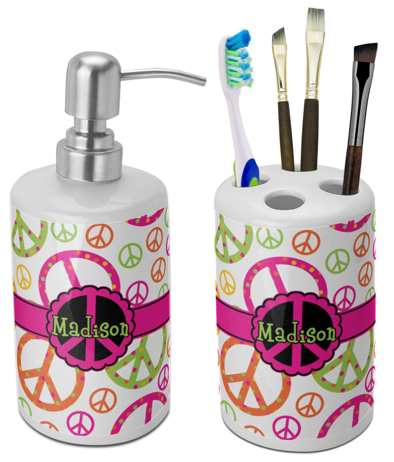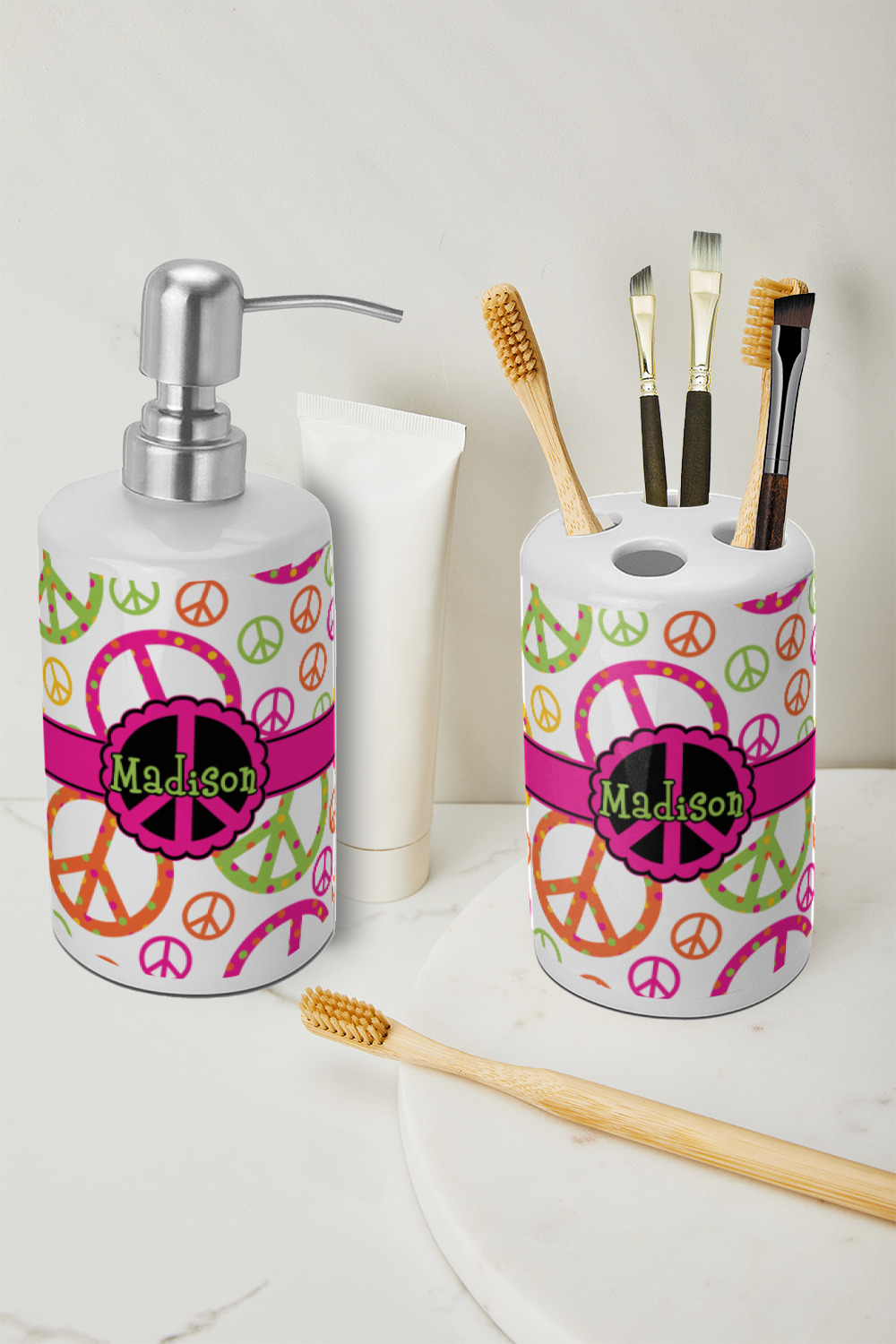 This two piece, ceramic bathroom set will add the perfect splash of color to any bathroom. This set includes one pump dispenser, ideal for soap or lotion, and one toothbrush holder with four holes. Although originally designed for toothbrushes, the holder will also hold make-up brushes, nail files, and other bathroom tools.