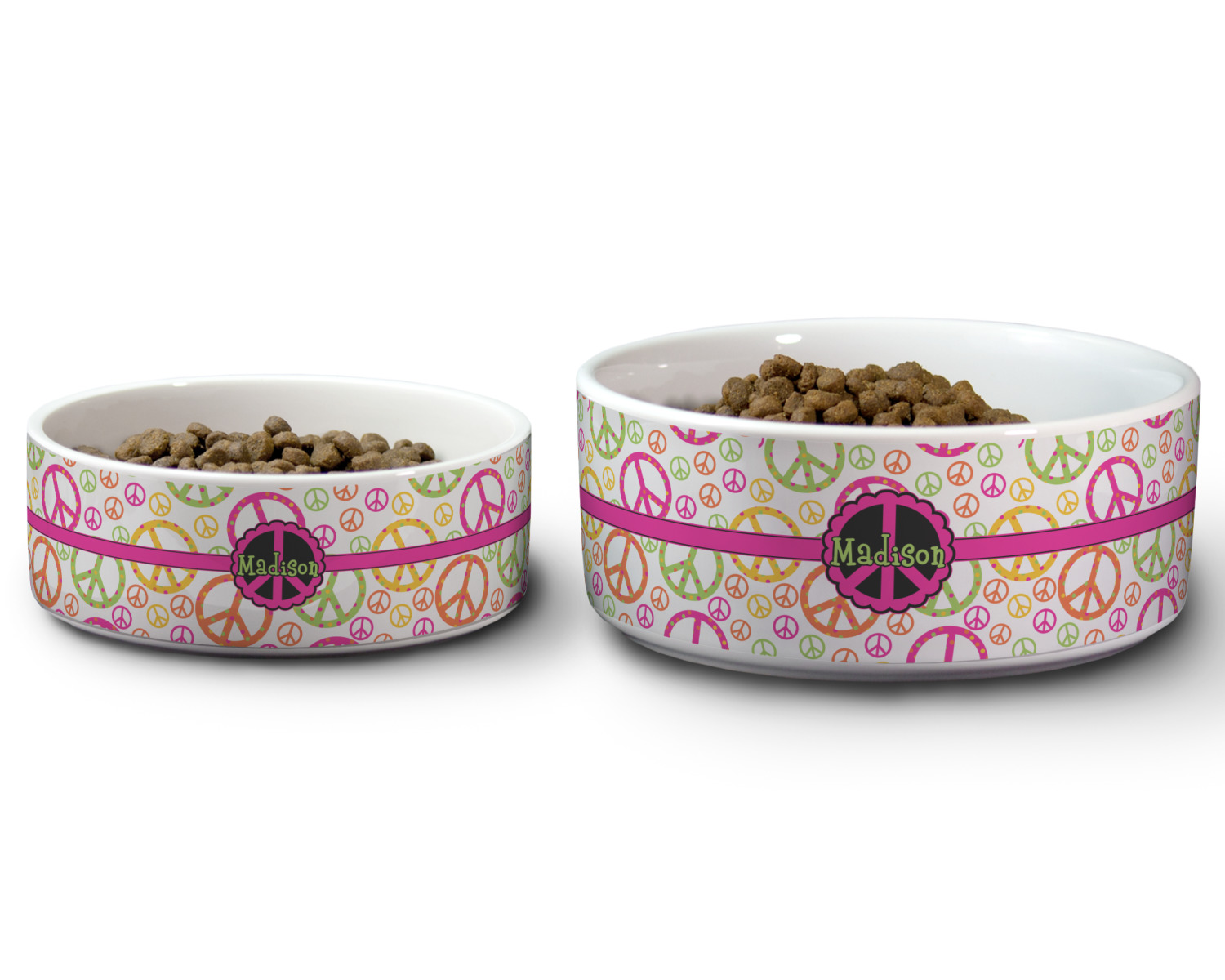Our customized, ceramic dog bowls allow you to fashion a durable, yet expressive gift for your pet. These bowls are fashionably versatile; they suit both cats and dogs and can hold either food or water. Add your pet's name or favorite color to the design, and spruce up his/her eating area with one or two personalized pet bowls!