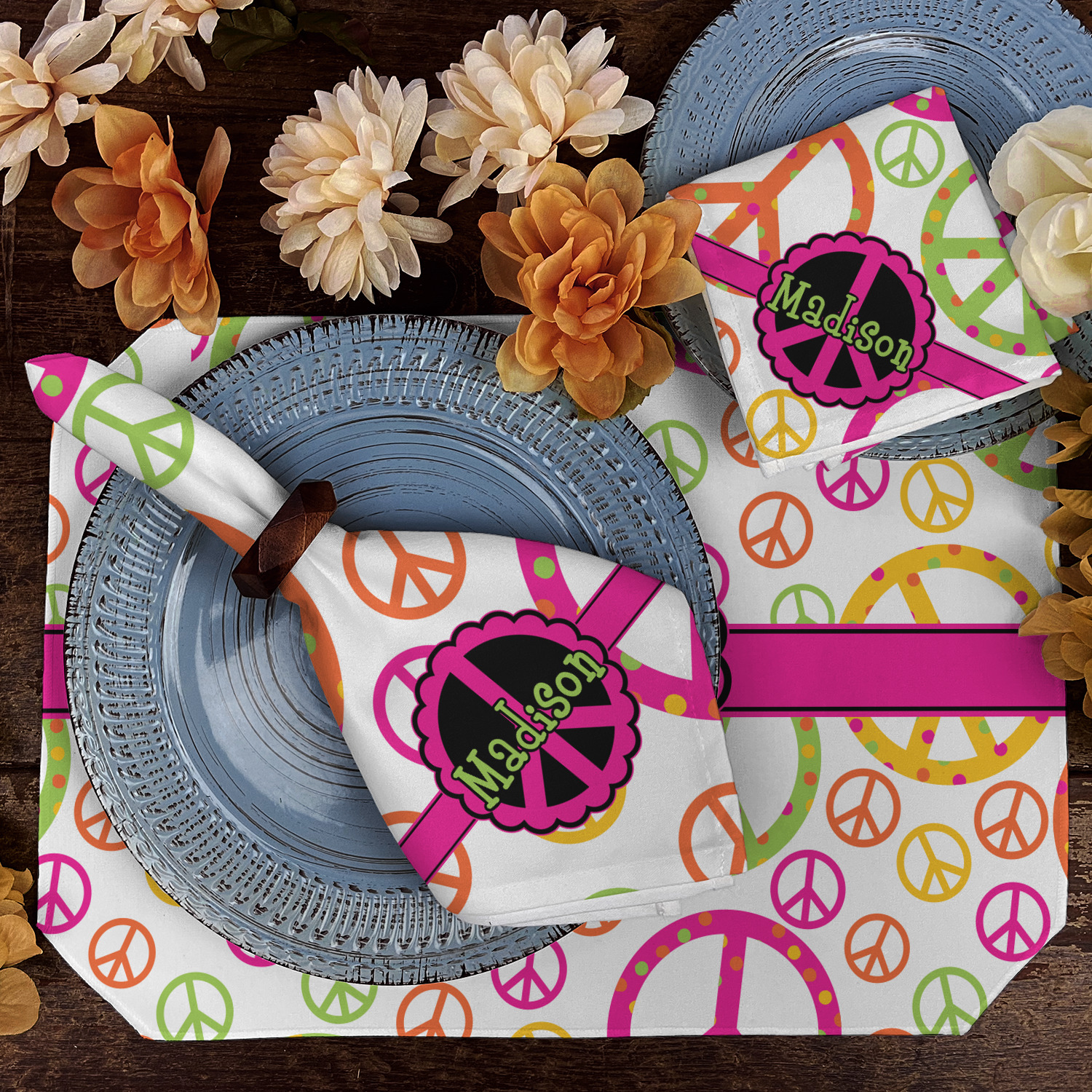 Each customizable cloth napkin is a polyester material guaranteed for long-term use. Since our napkins are cloth, it serves as a great reusable and eco-friendly dining decor. We sell personalized napkins individually or as a set of 4! Print your own unique design on all four napkins, or create four individual designs for each napkin! We offer two different napkin sizes - Cocktail napkins (approx. 10 x 10) and Dinner napkins (approx. 20 x 20). We print your design on one side, perfect for displaying your custom designed lunch napkins in any fold or table setting!
