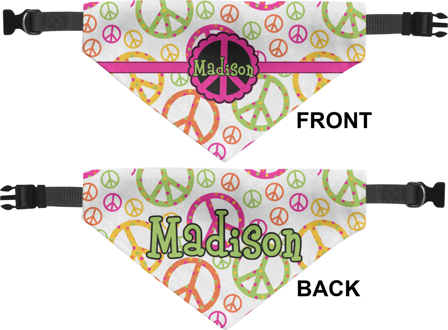 We print the front and back of these dog bandanas with your customized design. The bandana itself is made from a durable polyester, sewn together with a gap large enough to accommodate any collar. Regardless, the bandana includes a plain black, canvas collar with plastic snaps, that can easily be removed if desired. These dog bandana collars are available in four sizes: small, medium, large, and extra large. Please see our sizing chart for more information regarding the dimensions of each size.