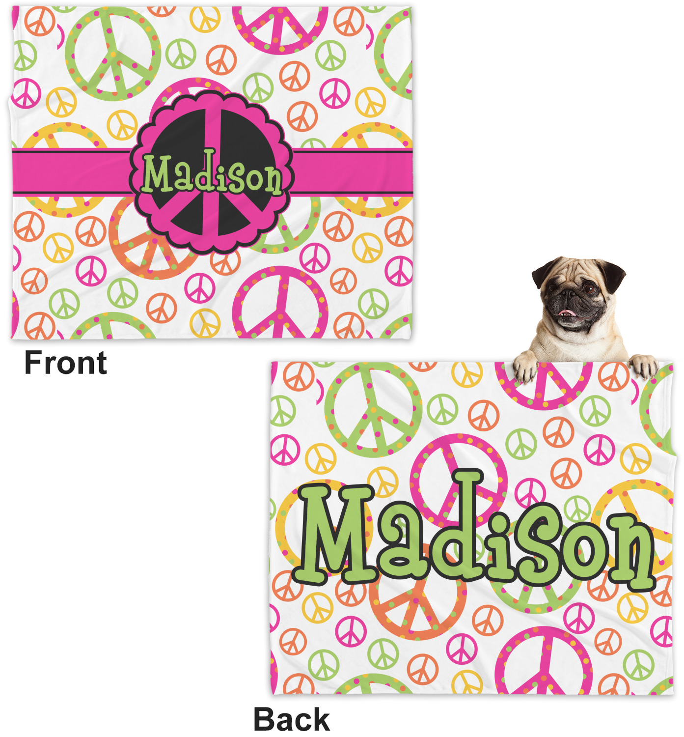 These dog blankets are crafted from a gentle, soft-to-the-touch, minky material. We print your customizations, either matching or differing, on both the top and underside of the blanket. These personalized dog blankets are available in two sizes: regular and large. Our regular size, at 40" x 30", accommodates small and some medium size dogs. At 60" x 50", our large dog blanket is a better fit for bigger breeds. Though specialized for dogs, these blankets still make a thoughtful gift for your favorite feline, or any other pet in mind!