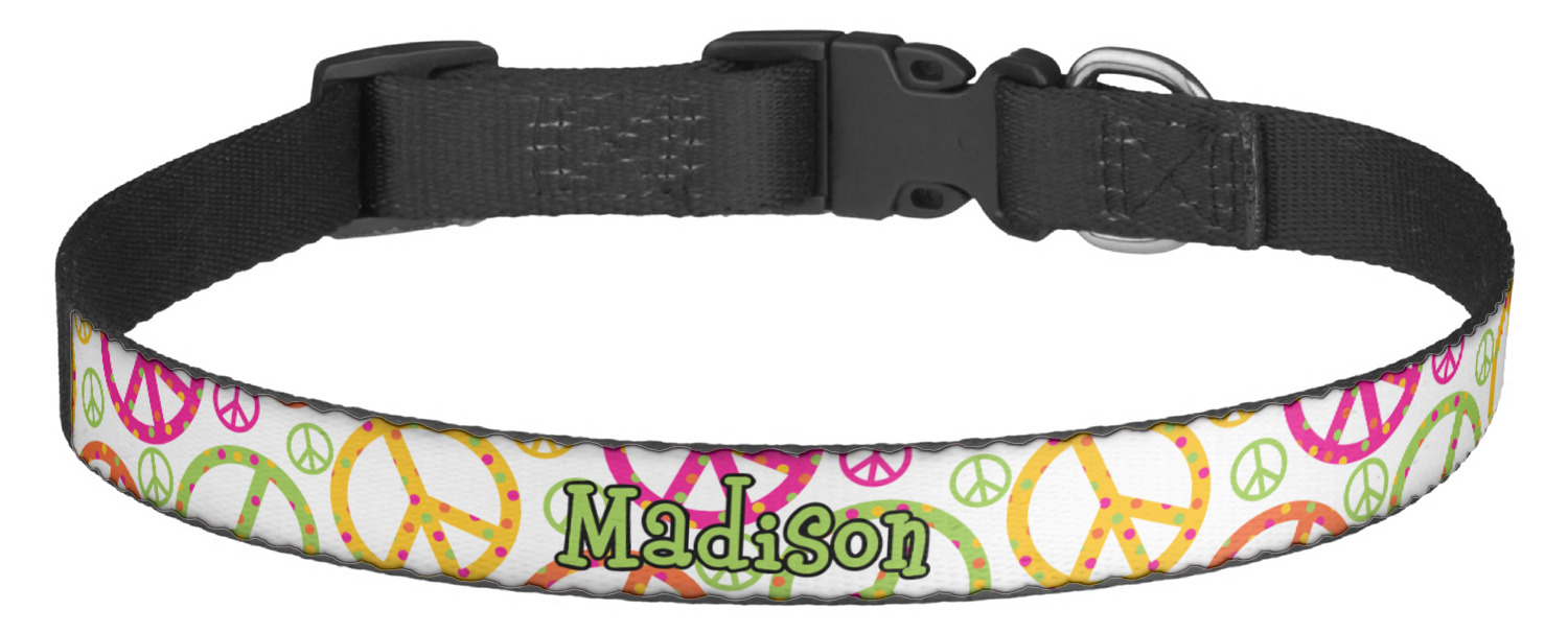 This sturdy collar, made from a durable nylon weave, will outlive your dog's episodes of excited tugging and pulling. Courtesy of its thick plastic buckle and adjuster, this collar is adjustable and accommodating of any dog. Structurally, the collar is a single piece of nylon weave that is sewn together, and features a solid metal loop where you can attach a leash or dog tag. We print and display your dog's name and pattern across the middle of the personalized dog collar.