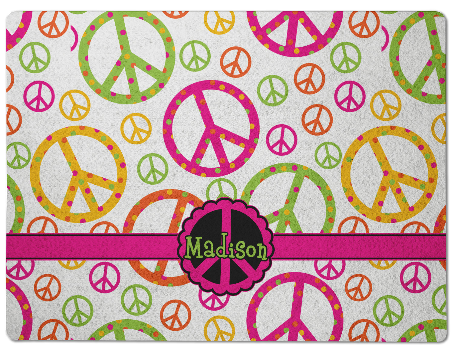 This design is totally groovy and will let the little hippie chick in you shine. Our peace sign design is simply adorable and has beautiful vibrant colors of pink, orange, lime green and yellow. The larger peace signs have fun polka dots and are surrounded by smaller solid colored peace signs.