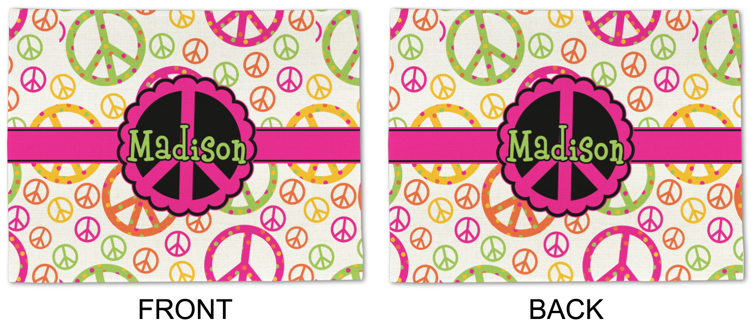 This design is totally groovy and will let the little hippie chick in you shine. Our peace sign design is simply adorable and has beautiful vibrant colors of pink, orange, lime green and yellow. The larger peace signs have fun polka dots and are surrounded by smaller solid colored peace signs.