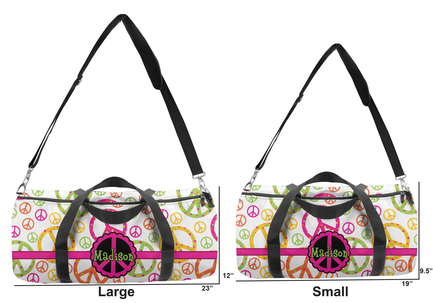 This duffle is a sturdy bag made of a canvas material. It comes in two sizes: Small (19"W x 9.5"H x 9.5"D) and Large (23"W x 12"H x 12"D). The bag is a cylindrical shape with a black adjustable strap and two handles. On one side is an elastic pouch to put a waterbottle or other small item. Your product will be sublimated with your design and is able to be designed on the front, back, and sides. Be sure to remember that the straps may cut into parts of your design if you upload your own artwork.