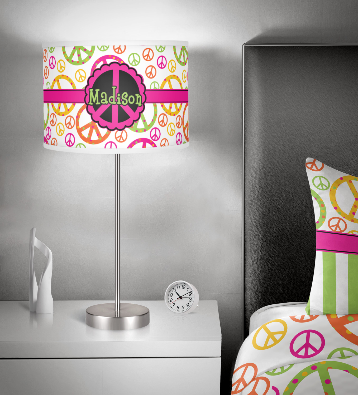 This design is totally groovy and will let the little hippie chick in you shine. Our peace sign design is simply adorable and has beautiful vibrant colors of pink, orange, lime green and yellow. The larger peace signs have fun polka dots and are surrounded by smaller solid colored peace signs.