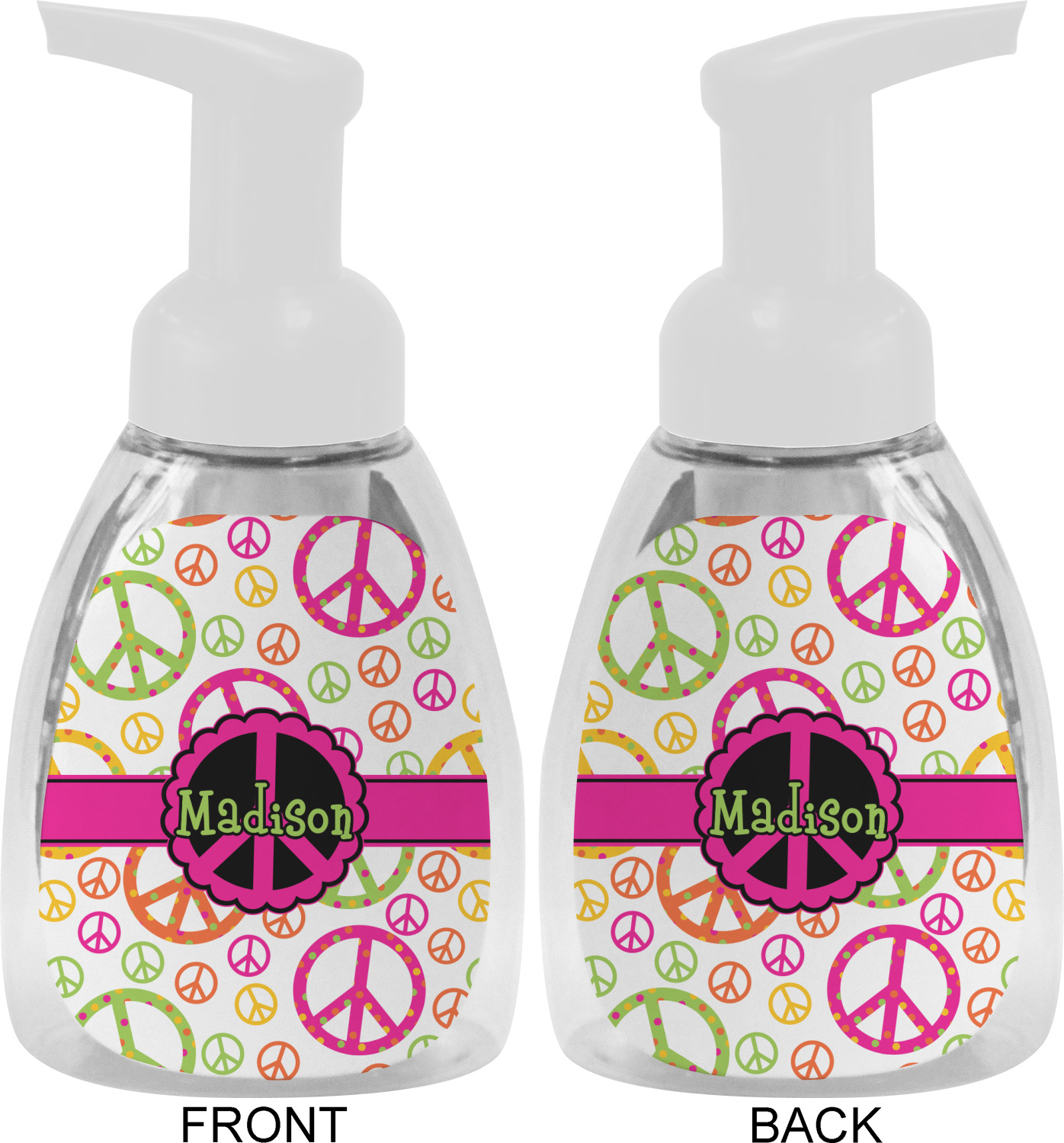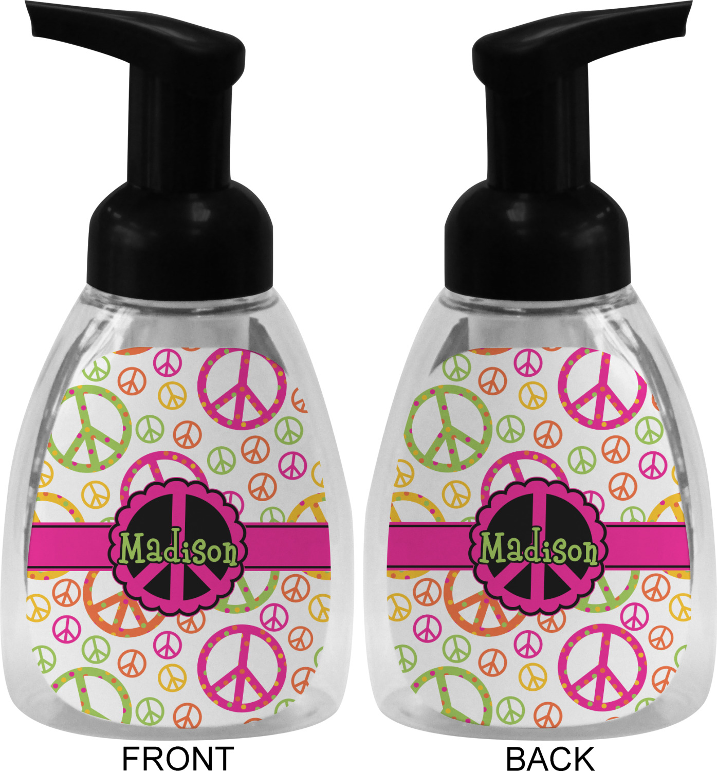 This soap dispenser is made of a robust plastic and has a clear base. The included soap pump is available in black or white color. This dispenser is 6.5 inches tall, 3 inches wide, and 2 inches deep. We display your customized designs on the front and back sides of these foaming hand soap dispensers.