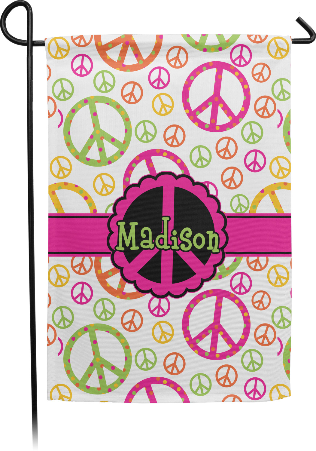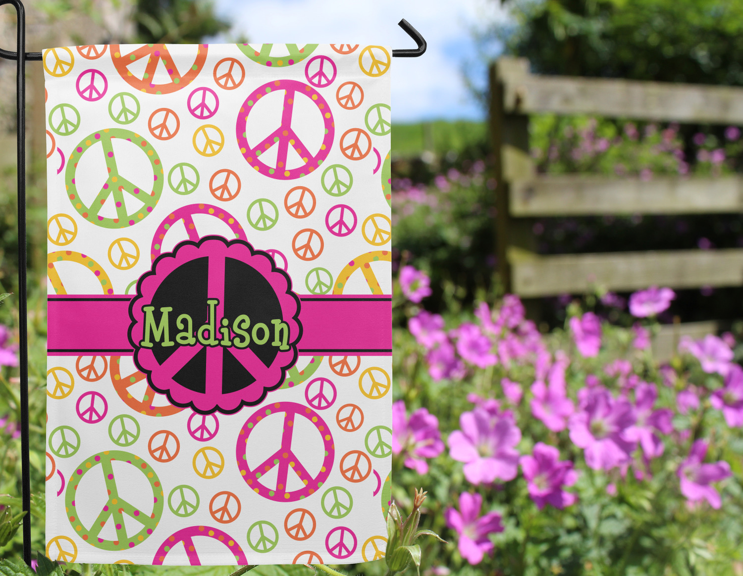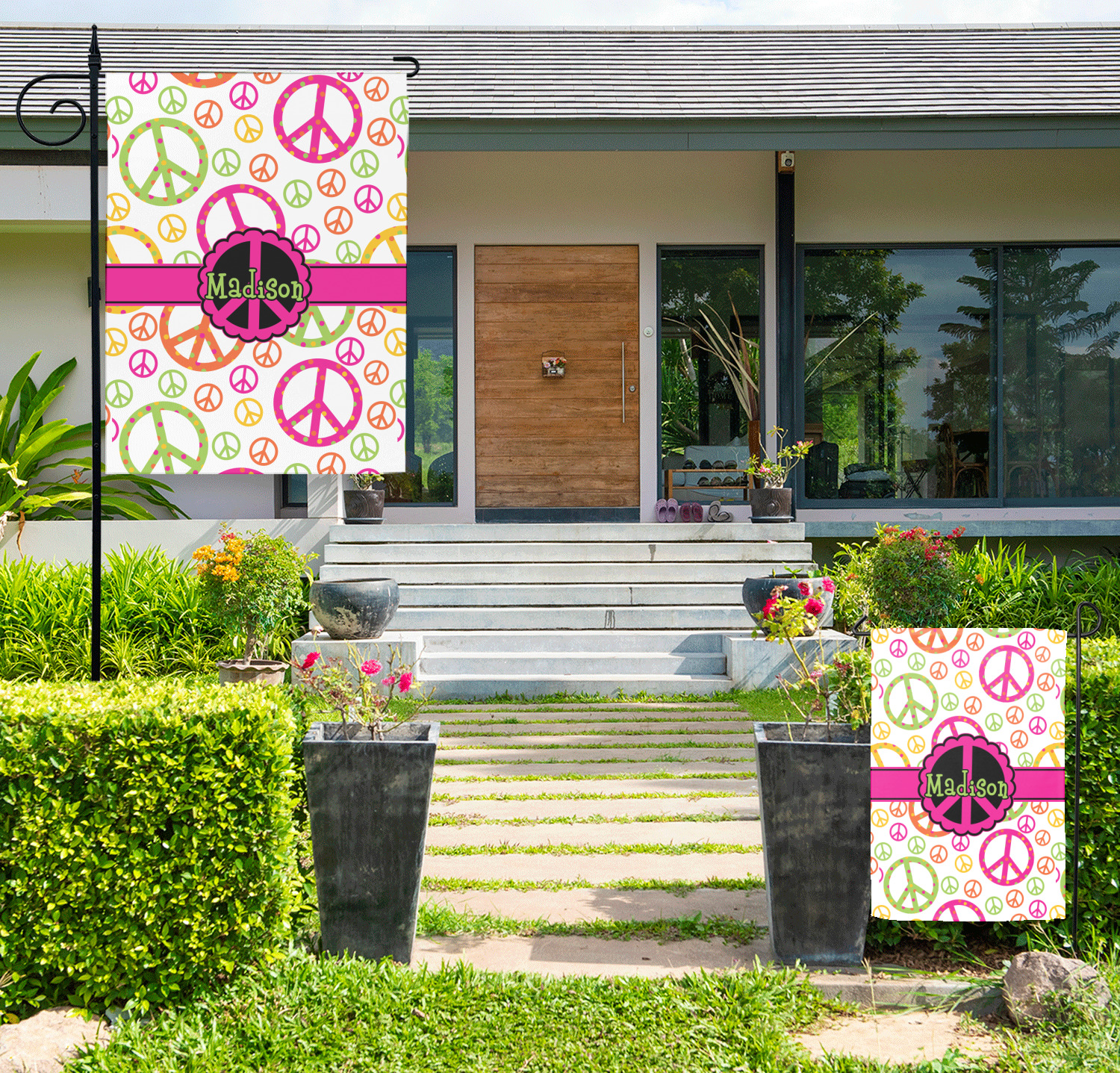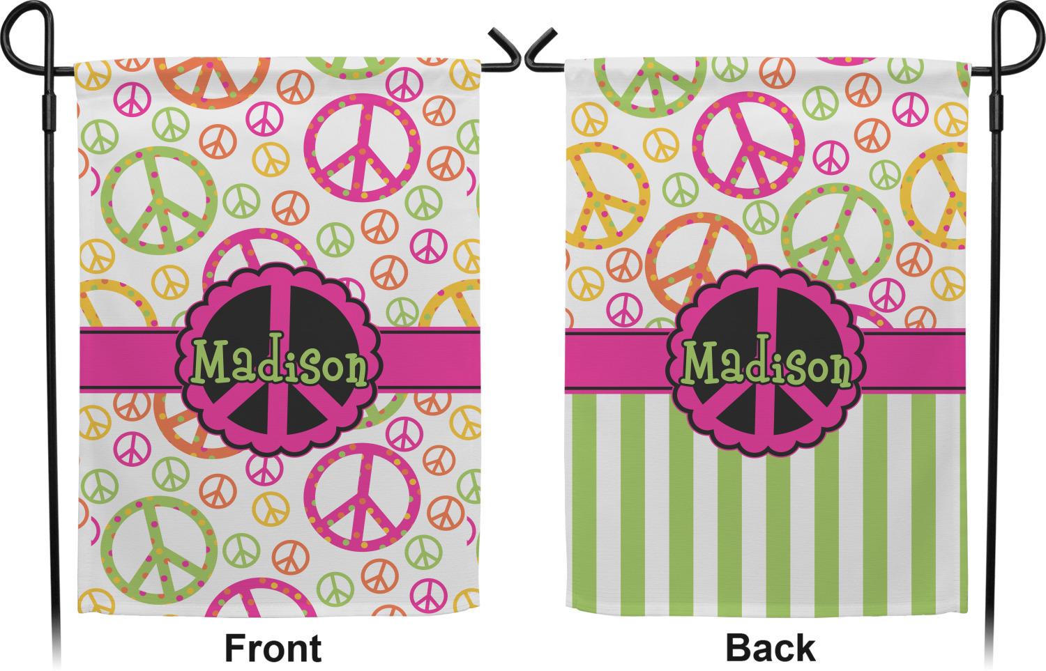 These custom garden flags are made of a durable, double-ply, polyester weave, allowing them to withstand the elements year round. The small flags measure at approximately 12 by 18 inches. The large flags measure out to 28 by 37 inches. You can order these decorative flags with your customization printed on the front only, or the front and back.