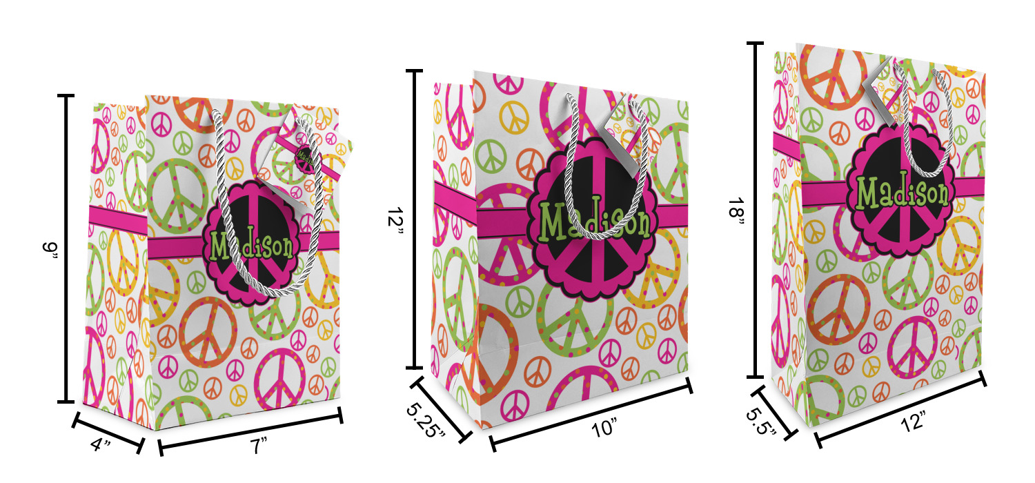 | Size (Varies By Option) | Small Gift Bag (7" x 4" x 9") Medium Gift Bag (10" x 5.25" x 12") Large Gift Bag (12" x 5.5" x 18") |