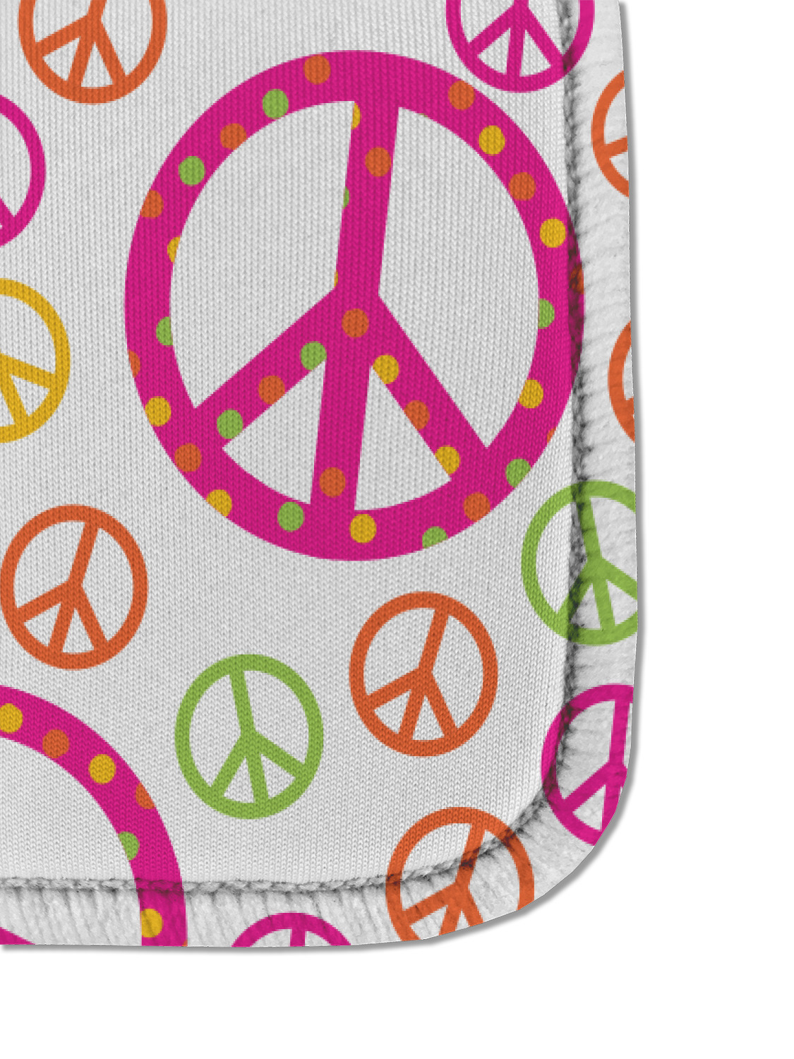 This design is totally groovy and will let the little hippie chick in you shine. Our peace sign design is simply adorable and has beautiful vibrant colors of pink, orange, lime green and yellow. The larger peace signs have fun polka dots and are surrounded by smaller solid colored peace signs.
