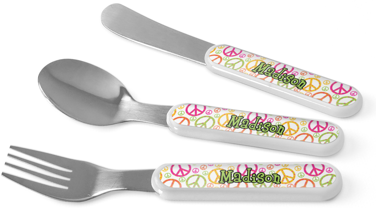 This set of kids' silverware includes a 5.5 inch spoon, fork, and knife, catered to your little one's needs. The prongs of this fork are flat and dull, while our spoon is small enough for tiny mouths, and the dullness of the knife itself resembles a butter knife, at most. These kids' utensils are made of stainless steel, while the handles are crafted from a durable plastic that will withstand the energy and use of your young one. We print your customization across the handles, making the cutlery set unique to your child only.