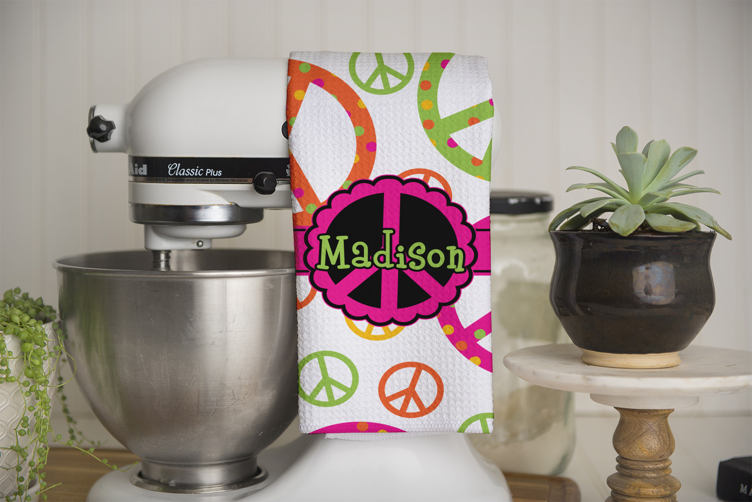 Each waffle weave kitchen towel is approximately 16 x 24 inches with your design printed on one side and the back is white.