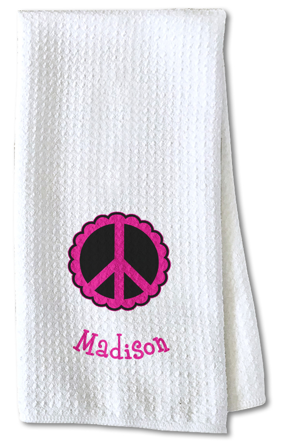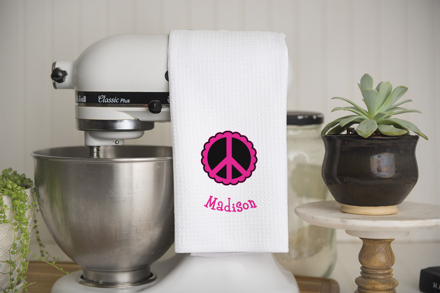 Each waffle weave kitchen towel is approximately 16 x 24 inches with your design printed on one side and the back is white.