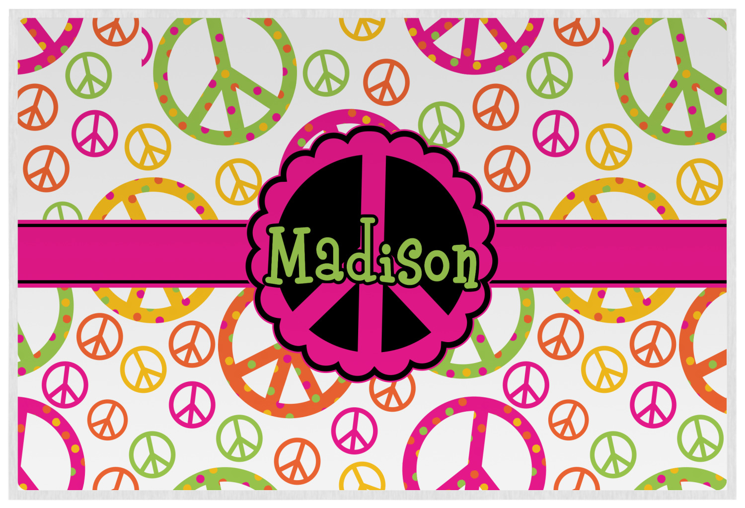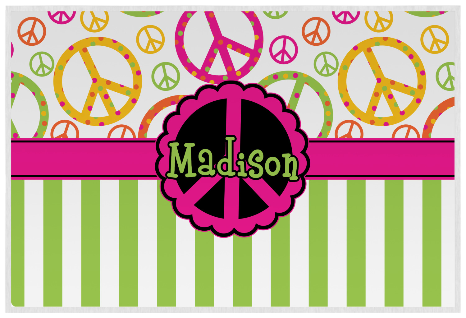 This design is totally groovy and will let the little hippie chick in you shine. Our peace sign design is simply adorable and has beautiful vibrant colors of pink, orange, lime green and yellow. The larger peace signs have fun polka dots and are surrounded by smaller solid colored peace signs.