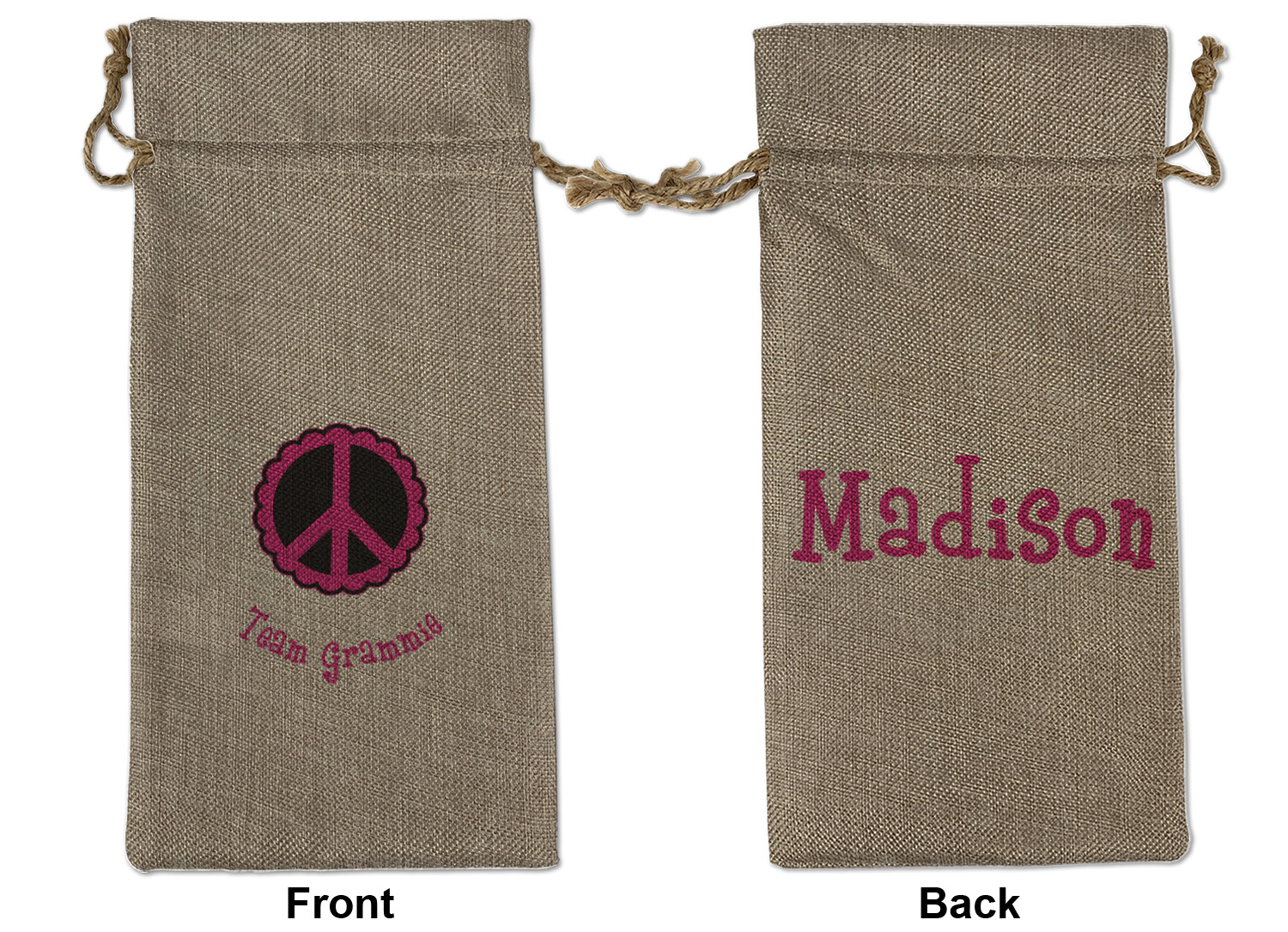 We sell our Burlap Gift Bags in 3 variant sized bags. Made with burlap polyester, each personalized bag can be secured with a twine drawstring pull. Your custom design is available to print on one side or both sides - completely up to you! The sizes of the bags measure approximately 4.5" x 6.5" for the smallest size, 6.5" x 8.0" for the medium size, and 6.5" x 13.5" for the large-sized bag.