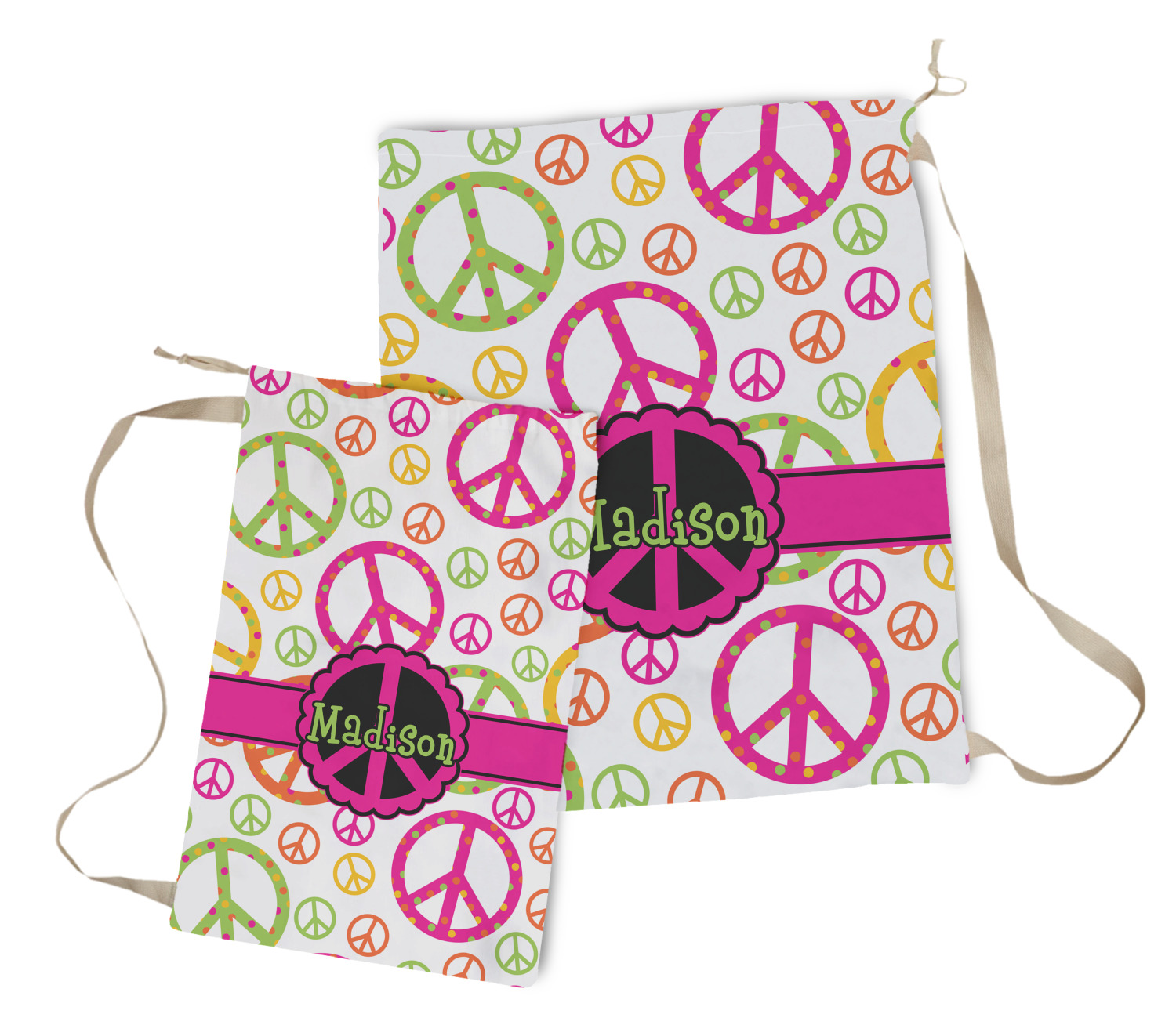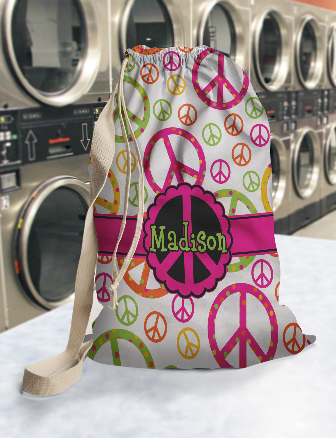 Carry your laundry in style with these customized laundry bags. Available in two sizes, featuring a natural colored woven strap and a cinch cord, these bags hold a lot of clothes or anything else you want to fit in them.