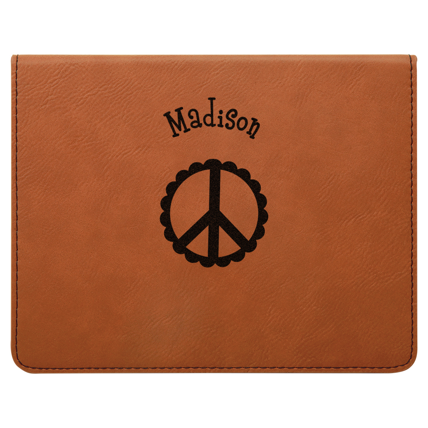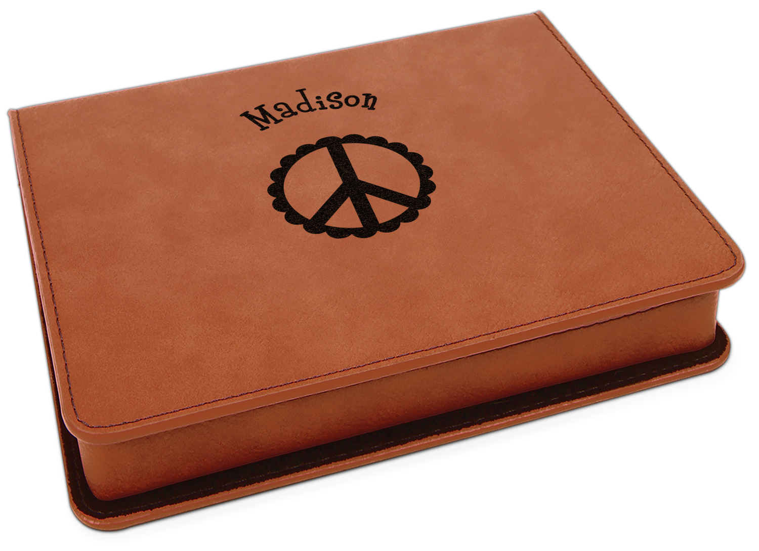This set includes a wine stopper, pourer, drip ring, and a corkscrew! The exterior of the box is a gorgeous, cognac-brown leatherette, while the interior is covered in a black, velvety material. Four foam indentations, unique to the shape of the wine tool, are found at the bottom half of the box's interior. The tools fit snugly into each of their designated spots, and the foam material helps to protect the integrity of your tools. Each of the wine gadgets features a bamboo accent, with the location and style depending on the tool itself. We laser engrave your personalized design onto the lid of the box, which easily flips open and is secured closed by a small magnet. The wine accessories box measures at 7 by 5.5 inches in total.