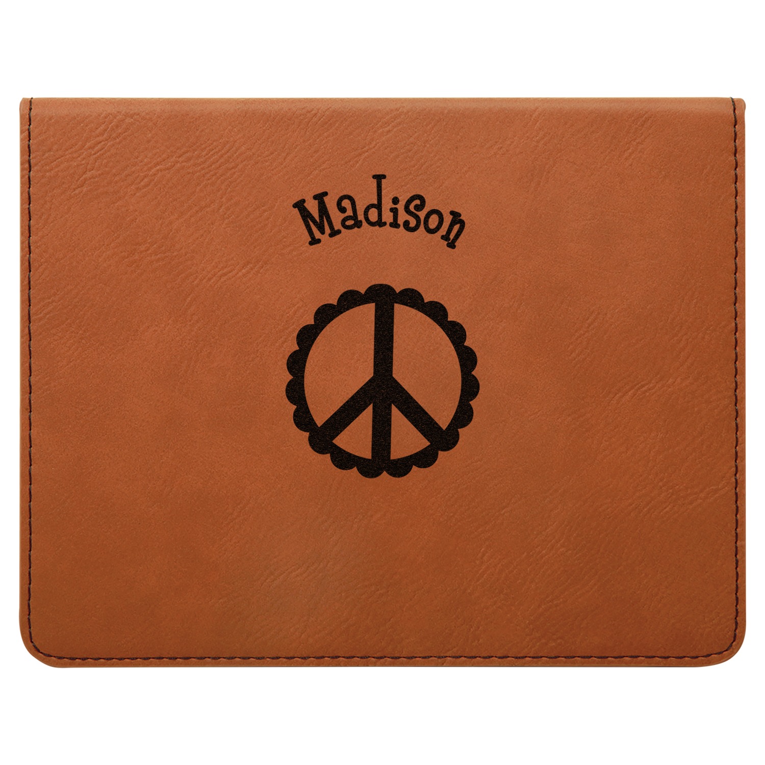 This set includes a wine stopper, pourer, drip ring, and a corkscrew! The exterior of the box is a gorgeous, cognac-brown leatherette, while the interior is covered in a black, velvety material. Four foam indentations, unique to the shape of the wine tool, are found at the bottom half of the box's interior. The tools fit snugly into each of their designated spots, and the foam material helps to protect the integrity of your tools. Each of the wine gadgets features a bamboo accent, with the location and style depending on the tool itself. We laser engrave your personalized design onto the lid of the box, which easily flips open and is secured closed by a small magnet. The wine accessories box measures at 7 by 5.5 inches in total.