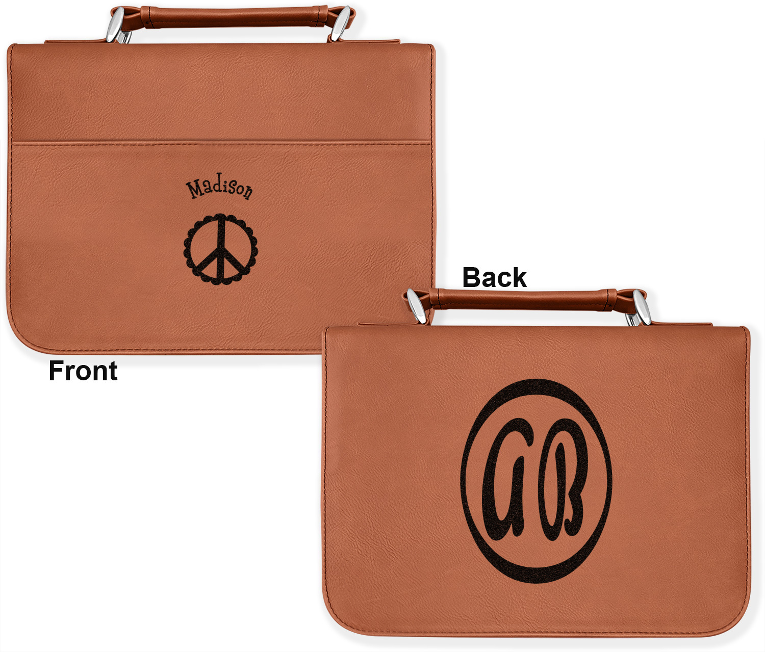 These book covers are fabricated from a fine leatherette in a warm, cognac shade of brown. A wide pocket spans across the front of the book jacket [2,400] and can store any loose papers or notes that you wish to keep. The interior of this personalized Bible cover includes slots on both sides to house the covers of your Bible, and keep it in place. The inside of the spine has a small elastic band to secure a pen. A zipper lines three sides of the cover, while the fourth side features a reinforced handle that allows for easy transport of your enclosed book.