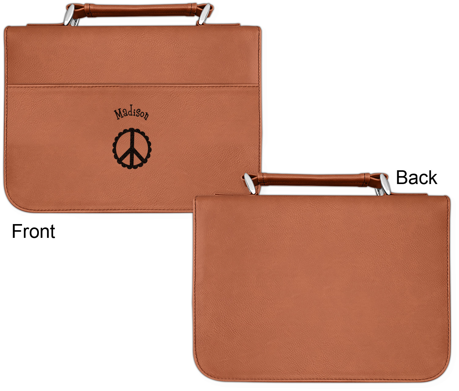 These book covers are fabricated from a fine leatherette in a warm, cognac shade of brown. A wide pocket spans across the front of the book jacket [2,400] and can store any loose papers or notes that you wish to keep. The interior of this personalized Bible cover includes slots on both sides to house the covers of your Bible, and keep it in place. The inside of the spine has a small elastic band to secure a pen. A zipper lines three sides of the cover, while the fourth side features a reinforced handle that allows for easy transport of your enclosed book.