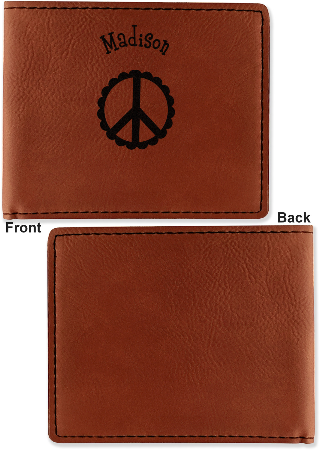 Your bifold wallet will be personalized by laser engraving, which will be a black color on the wallet. Choose a graphic, text, or monogram to personalize your wallet. There are thousands of choices in our design center.