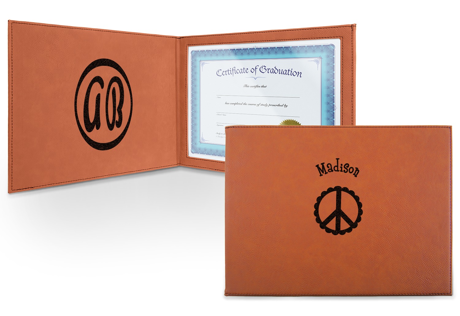 This cognac-colored, leatherette certificate jacket is the ideal way to display or store your hard-earned certificate. When closed, the custom certificate holder measures at 12 by 9 inches. The interior of the certificate cover includes a clear, vinyl window to encase your diploma. The window measures at around 10.5 by 7.5 inches and can accommodate a diploma that measures at up to 8.5 by 11 inches. You can either choose to have your customization laser engraved on the front and interior, or solely the front.