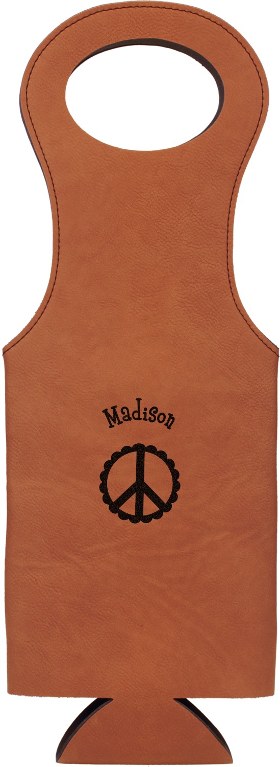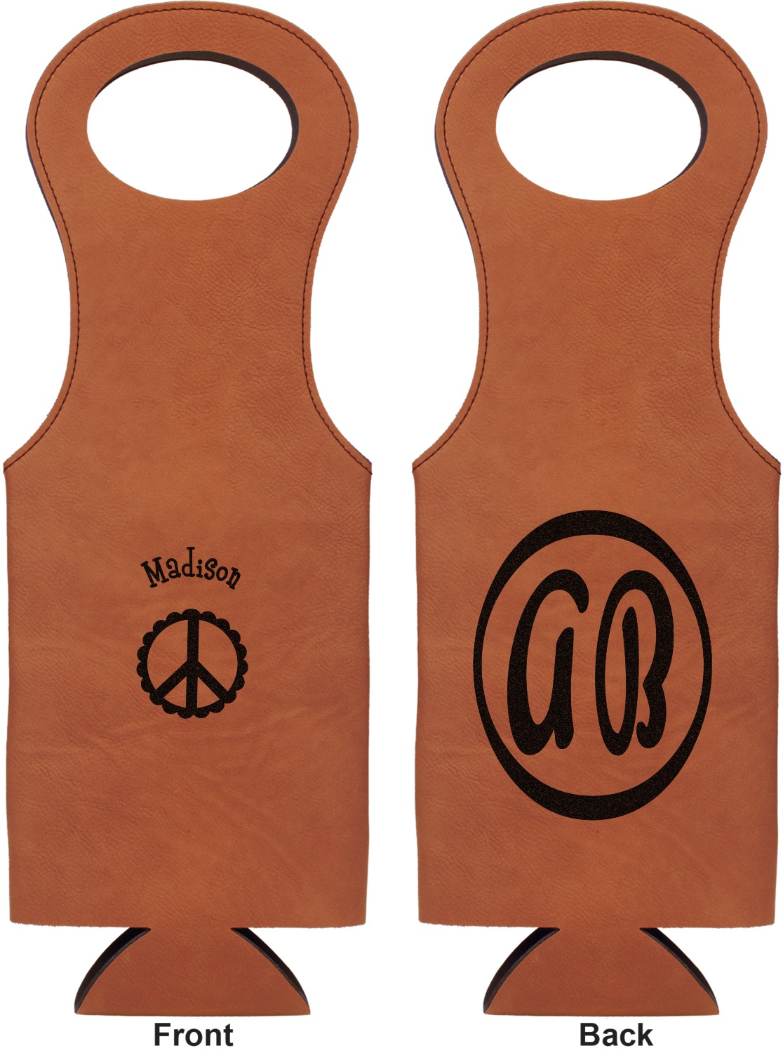 This wine carrier is made from a stunning leatherette, in a cognac-brown color. Strong, black stitching lines the sides of your wine bottle bag and provides extra durability. The interior is lined with a padded, black material to allow for a snug fit once your bottle is placed inside. At the top of this wine gift bag, you'll find two oval shaped handles that elegantly complements the rest of the bag's style. We provide you with the option of laser-engraving the front, or the front and back of your new personalized wine bag!