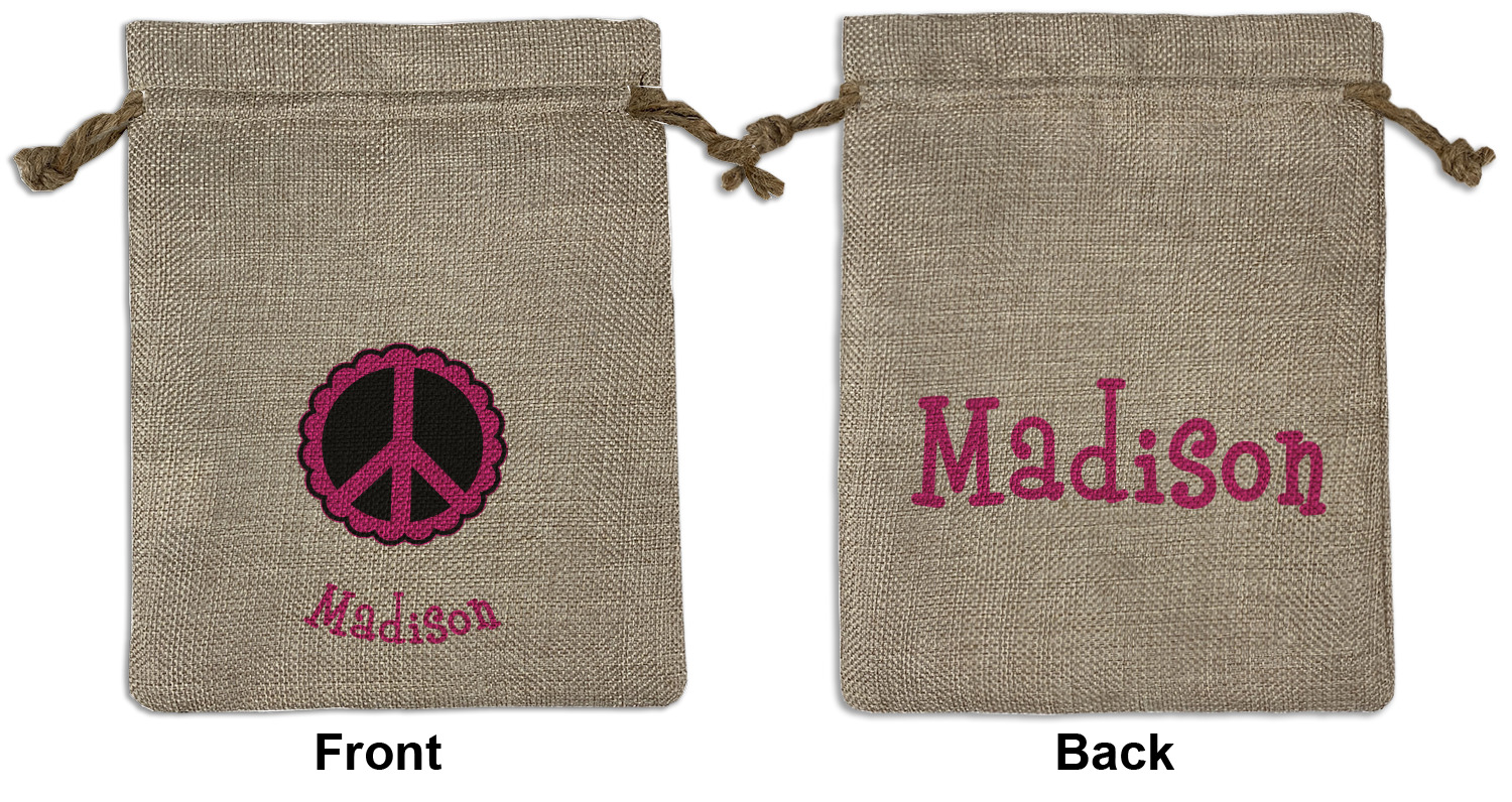 We sell our Burlap Gift Bags in 3 variant sized bags. Made with burlap polyester, each personalized bag can be secured with a twine drawstring pull. Your custom design is available to print on one side or both sides - completely up to you! The sizes of the bags measure approximately 4.5" x 6.5" for the smallest size, 6.5" x 8.0" for the medium size, and 6.5" x 13.5" for the large-sized bag.