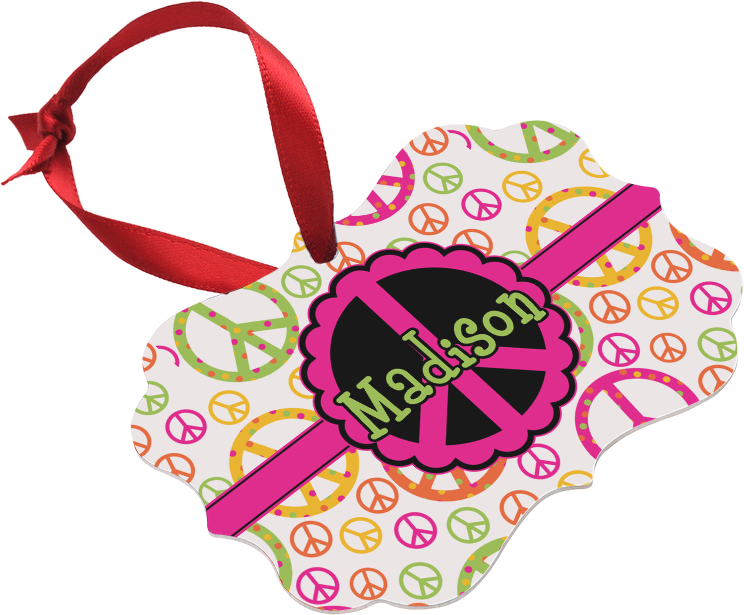 The design has a classic hot pink ribbon trimmed with black, and the label is a beautiful scalloped peace sign in black and hot pink. Personalize of your choice is done in a beautiful lime green color outlined in black.