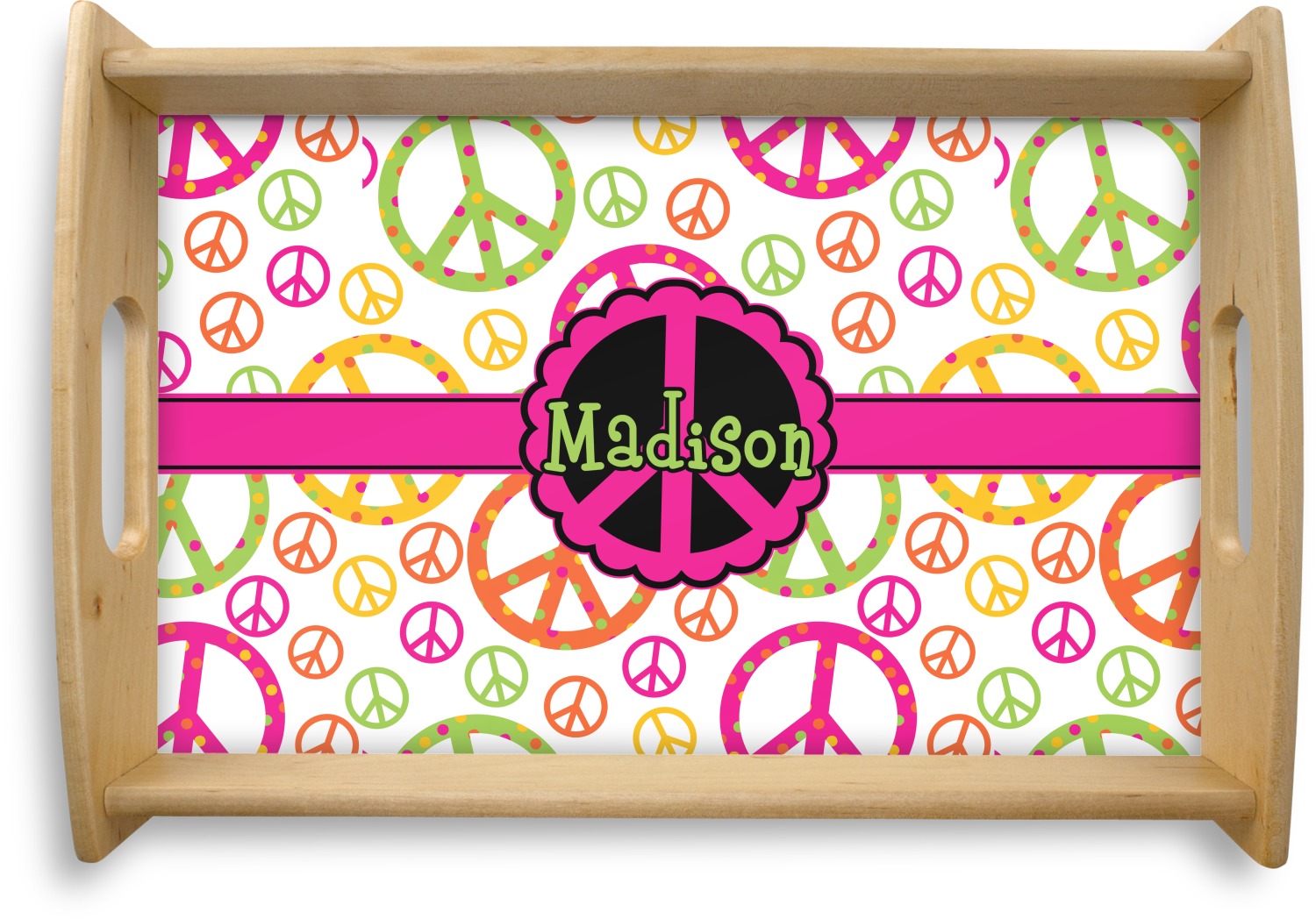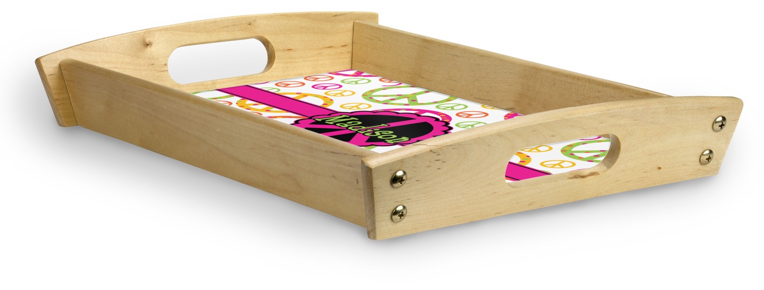 This serving tray with handles features square edges and two rounded sides, creating a very modern look. Each side is fabricated from a beautifully cut, natural wood. The bottom of the interior of the tray displays your customized design in bright, vibrant color. The tray is sold in both a black color and a natural wood look. Each variation of the wood serving tray has two sizes: Small, which is 14" x 10" x 2.25", and Large, which is 19.5" x 13.5" x 2.75".