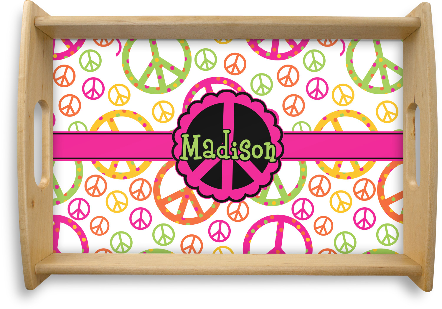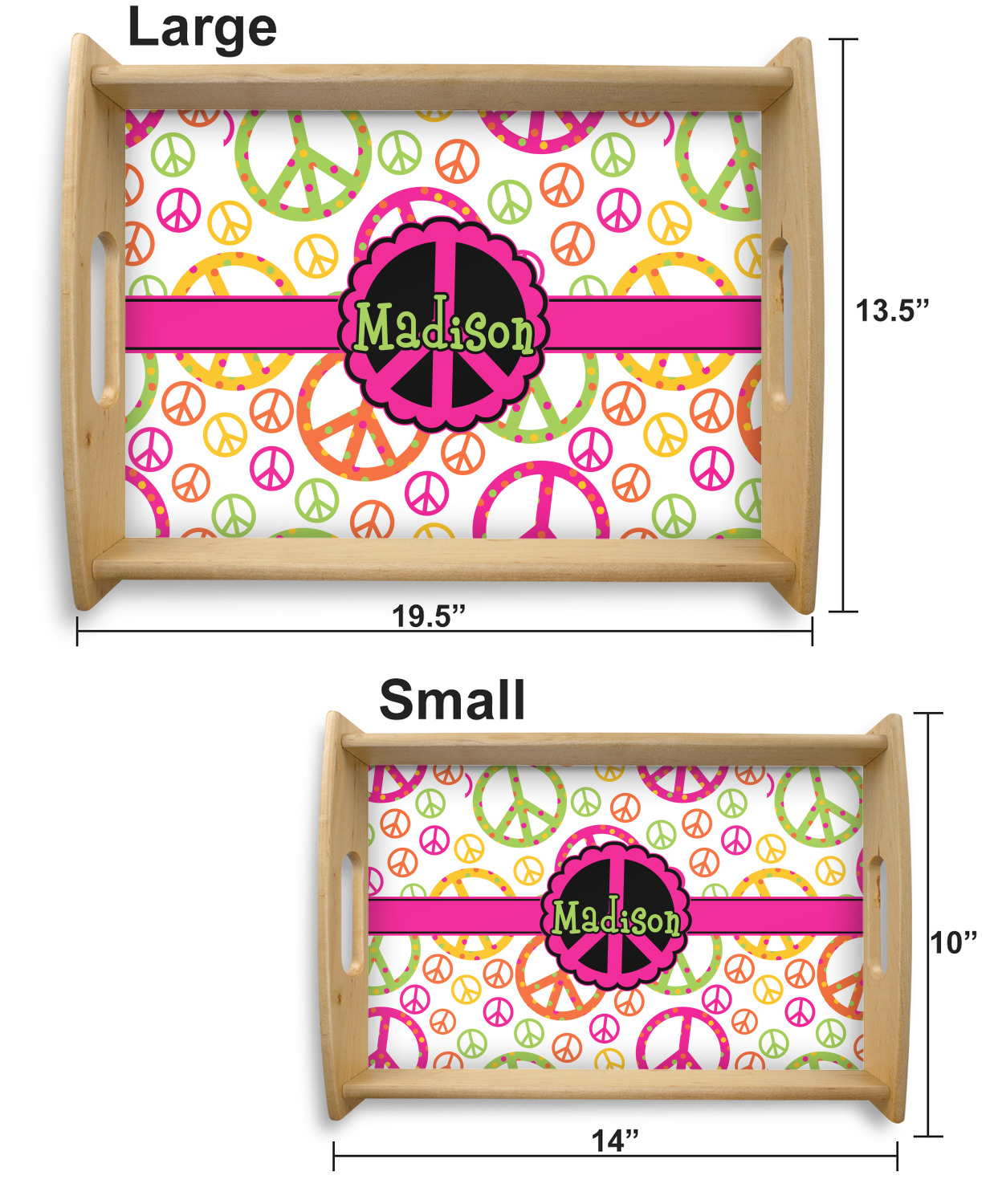 This serving tray with handles features square edges and two rounded sides, creating a very modern look. Each side is fabricated from a beautifully cut, natural wood. The bottom of the interior of the tray displays your customized design in bright, vibrant color. The tray is sold in both a black color and a natural wood look. Each variation of the wood serving tray has two sizes: Small, which is 14" x 10" x 2.25", and Large, which is 19.5" x 13.5" x 2.75".