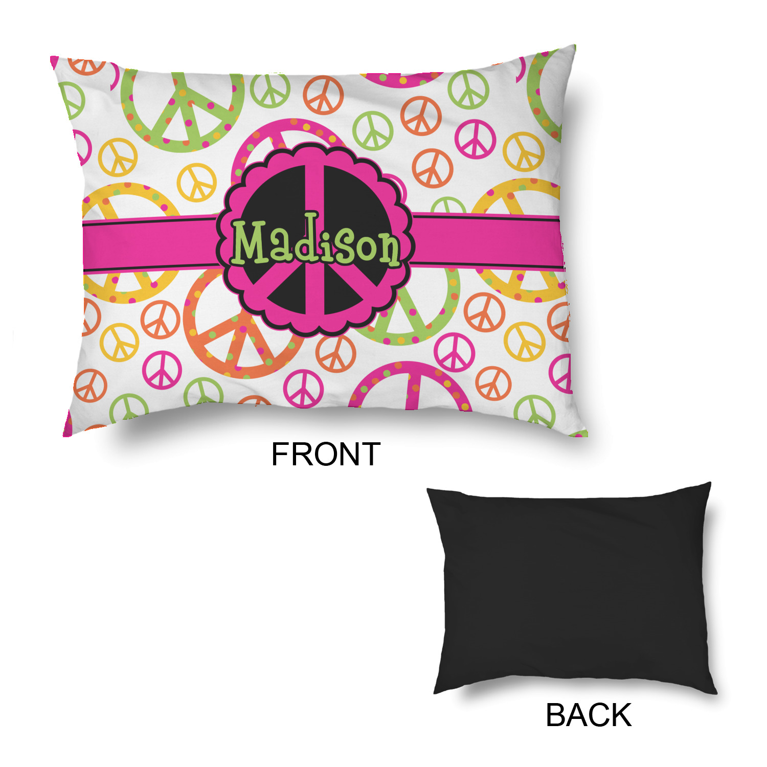 This design is totally groovy and will let the little hippie chick in you shine. Our peace sign design is simply adorable and has beautiful vibrant colors of pink, orange, lime green and yellow. The larger peace signs have fun polka dots and are surrounded by smaller solid colored peace signs.