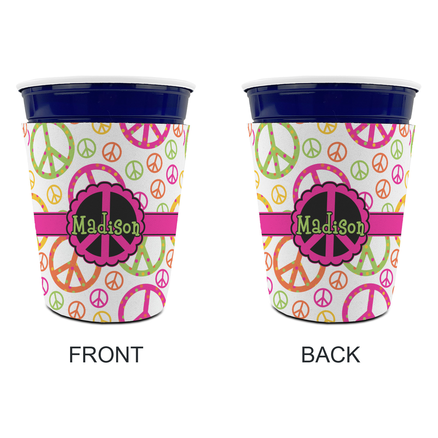 Made from neoprene with a polyester outer fabric and sewn seams, these premium quality party cup sleeves are very durable and will hold up to heavy use. They are available in 2 styles - with a bottom or just a sleeve to go around the outside of the tapered cup. The sleeve covers are about 4" tall and cover about 90% of the classic 16 oz. Solo cup.