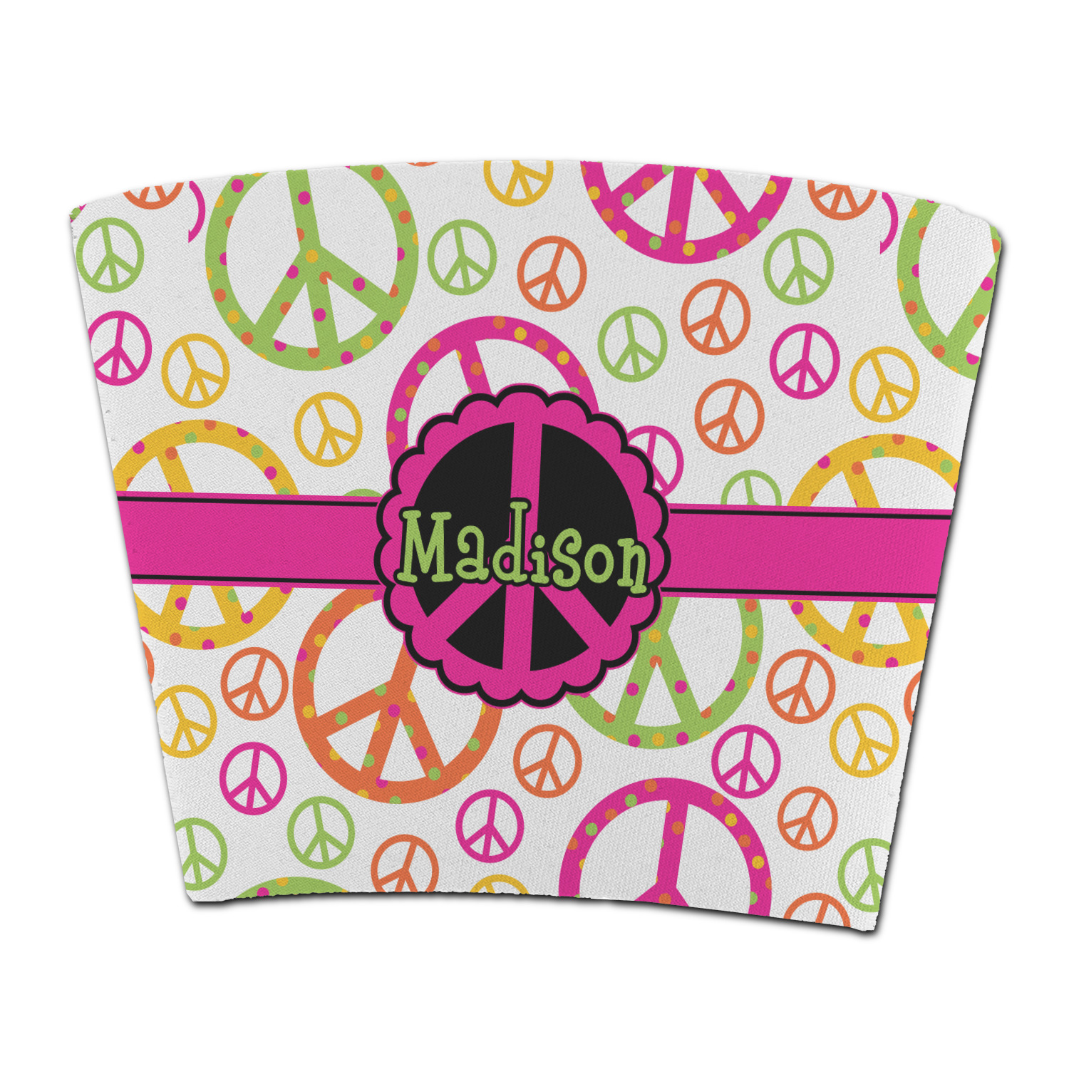 This design is totally groovy and will let the little hippie chick in you shine. Our peace sign design is simply adorable and has beautiful vibrant colors of pink, orange, lime green and yellow. The larger peace signs have fun polka dots and are surrounded by smaller solid colored peace signs.