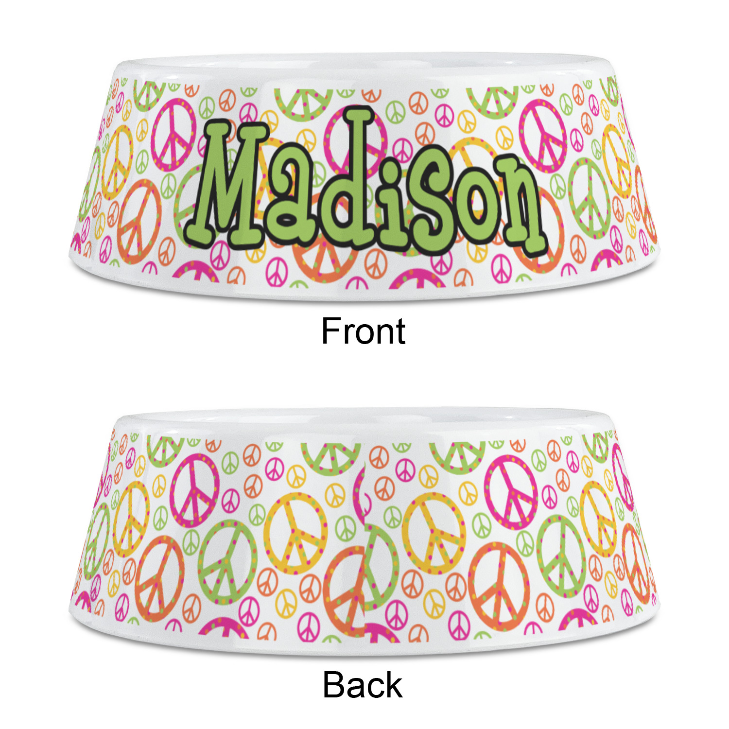 This design is totally groovy and will let the little hippie chick in you shine. Our peace sign design is simply adorable and has beautiful vibrant colors of pink, orange, lime green and yellow. The larger peace signs have fun polka dots and are surrounded by smaller solid colored peace signs.