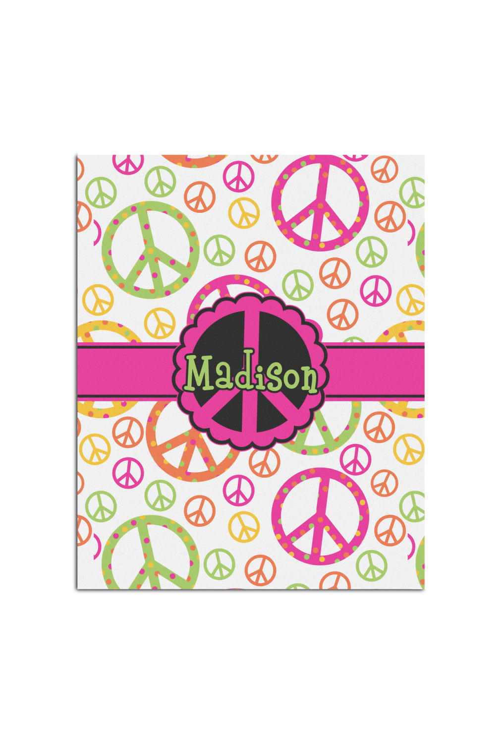 This design is totally groovy and will let the little hippie chick in you shine. Our peace sign design is simply adorable and has beautiful vibrant colors of pink, orange, lime green and yellow. The larger peace signs have fun polka dots and are surrounded by smaller solid colored peace signs.