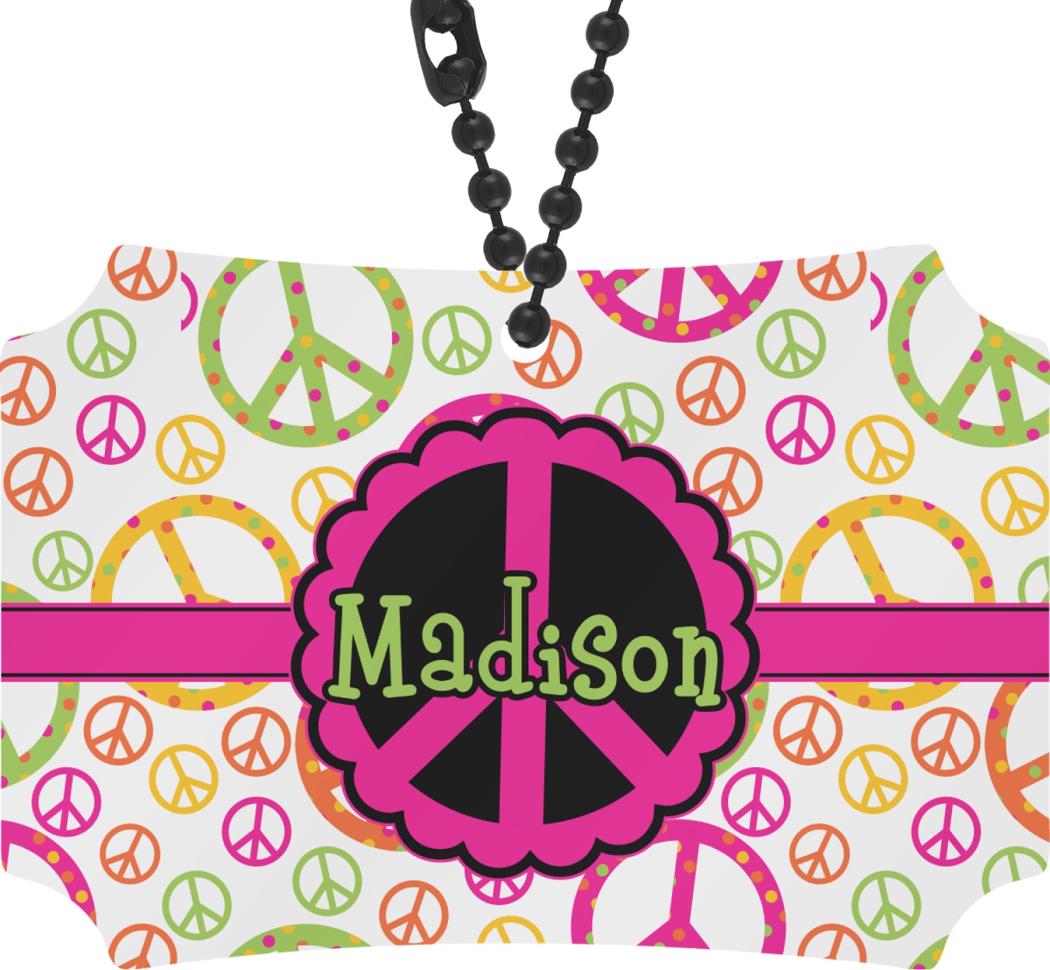 The design has a classic hot pink ribbon trimmed with black, and the label is a beautiful scalloped peace sign in black and hot pink. Personalize of your choice is done in a beautiful lime green color outlined in black.