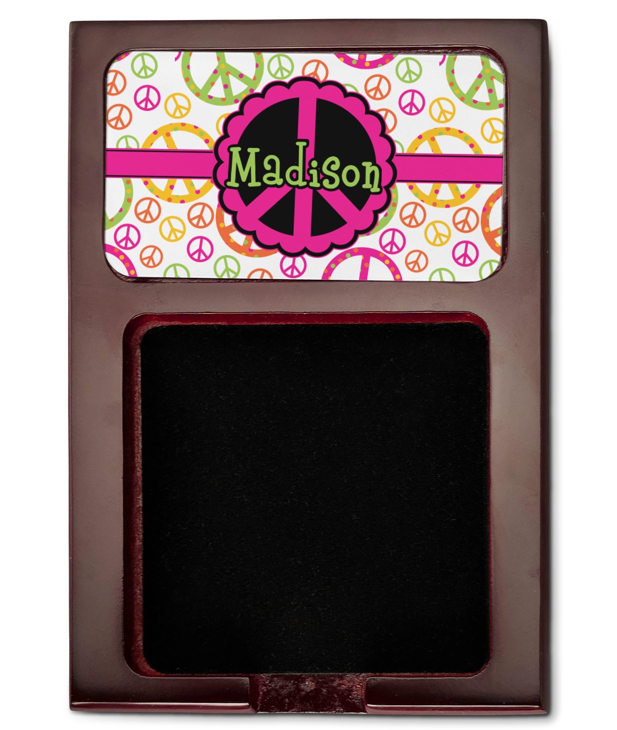 Crafted from a fine mahogany, this post it note holder is in the shade of a dark, cherry color. The dispenser itself is about 4.25 by 6.25 by 0.75 inches. You can place your 3 by 3 inch sticky notes in the indentation below the nameplate. We print your customization onto the nameplate that rests above the velvety indentation.