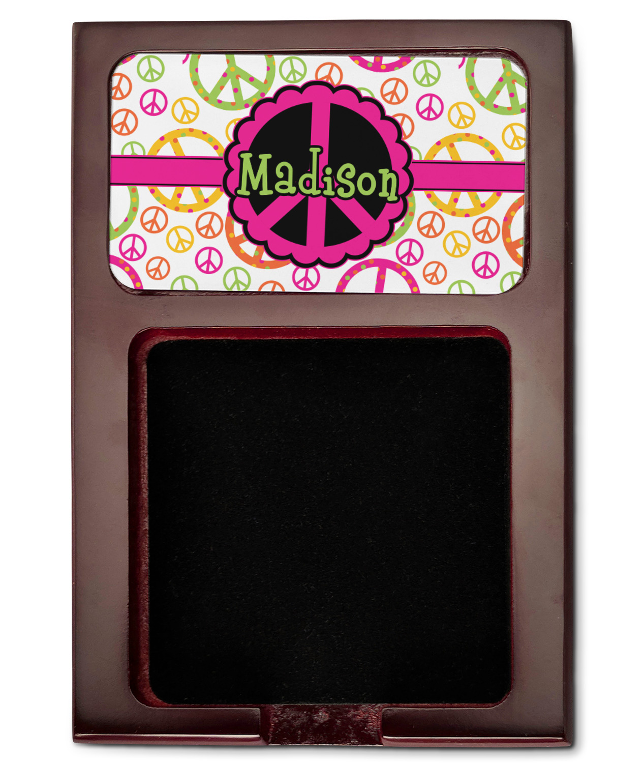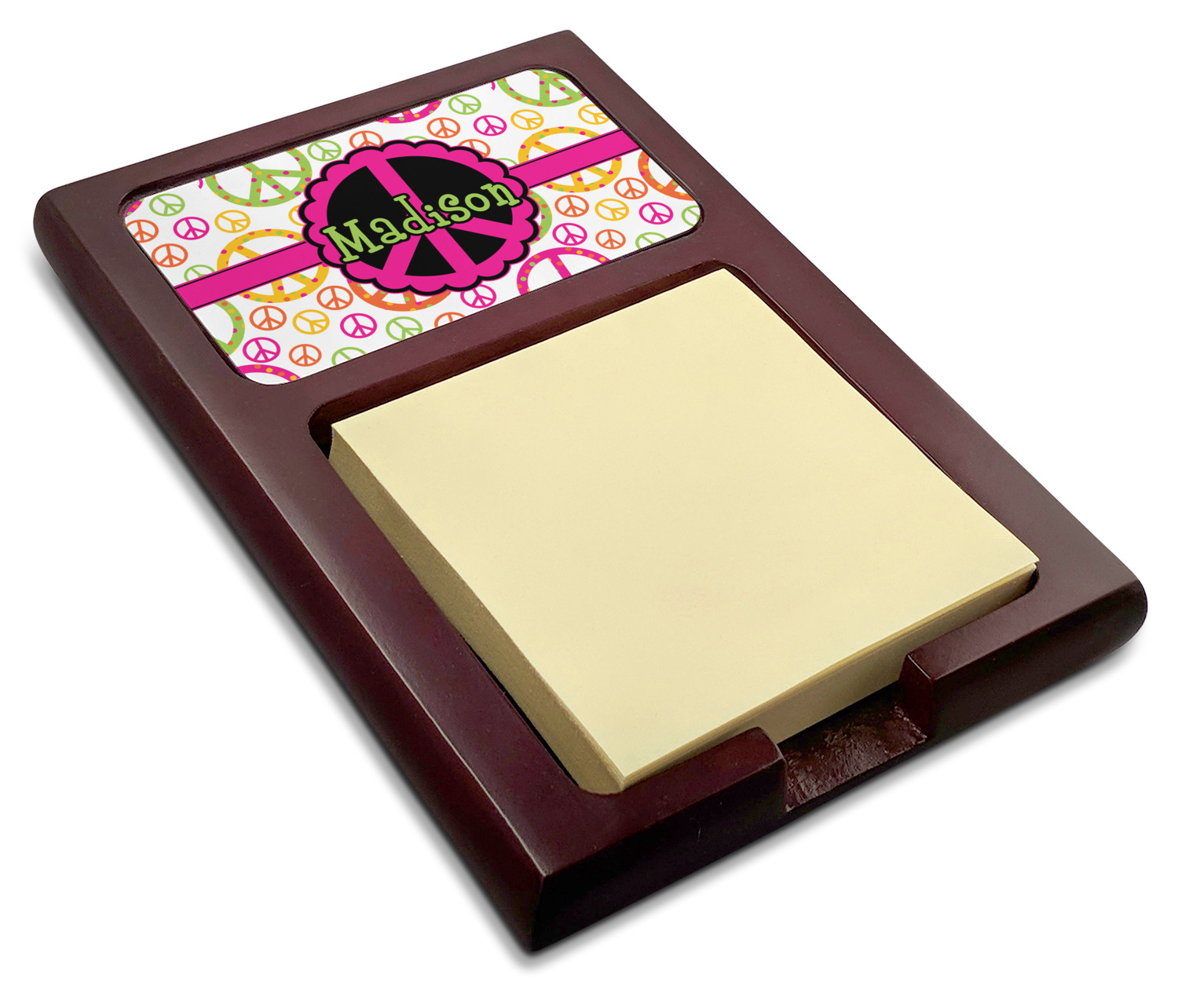 Crafted from a fine mahogany, this post it note holder is in the shade of a dark, cherry color. The dispenser itself is about 4.25 by 6.25 by 0.75 inches. You can place your 3 by 3 inch sticky notes in the indentation below the nameplate. We print your customization onto the nameplate that rests above the velvety indentation.
