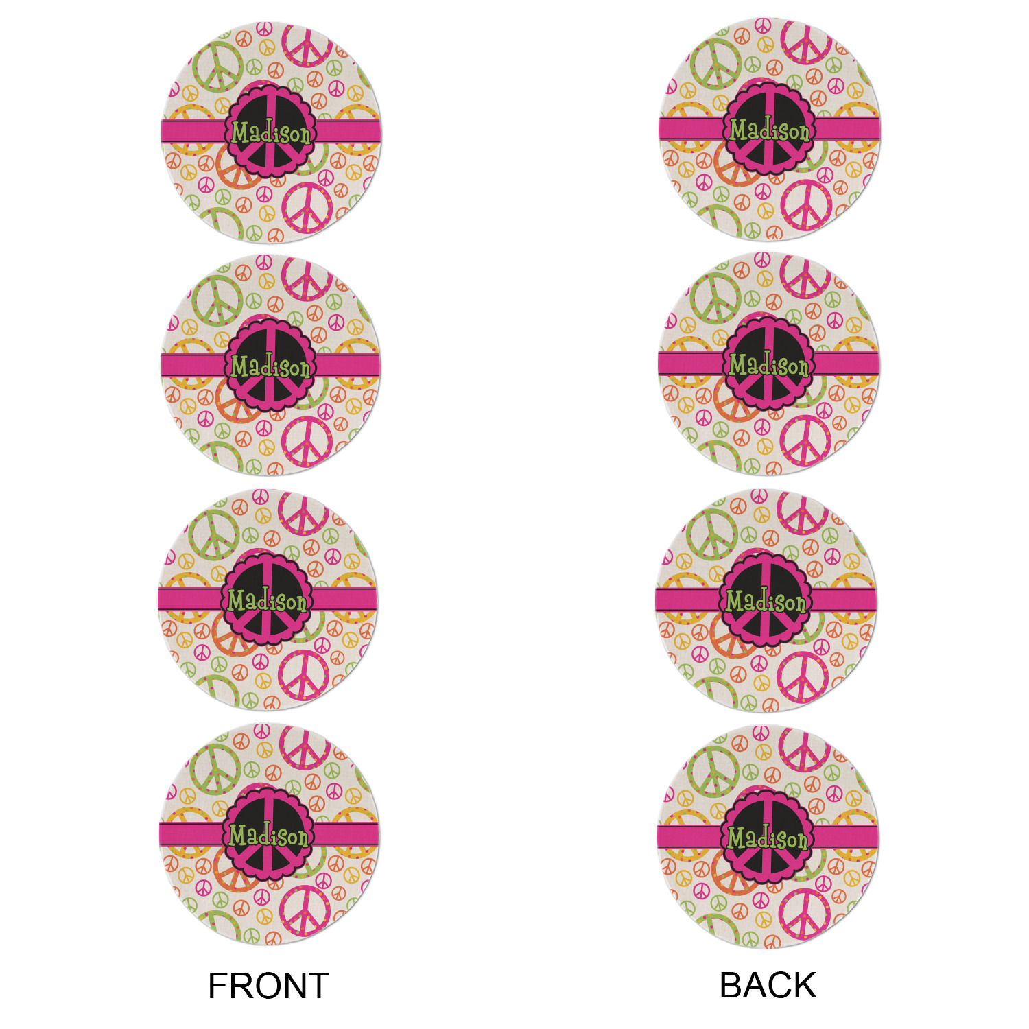 The design has a classic hot pink ribbon trimmed with black, and the label is a beautiful scalloped peace sign in black and hot pink. Personalize of your choice is done in a beautiful lime green color outlined in black.