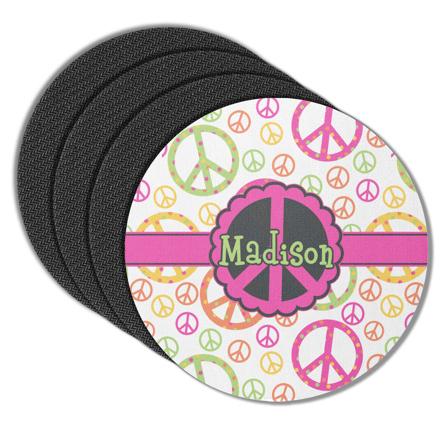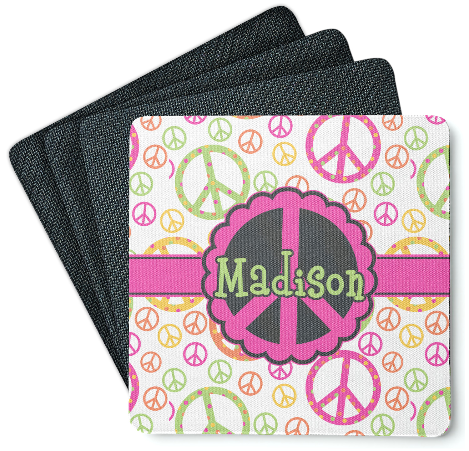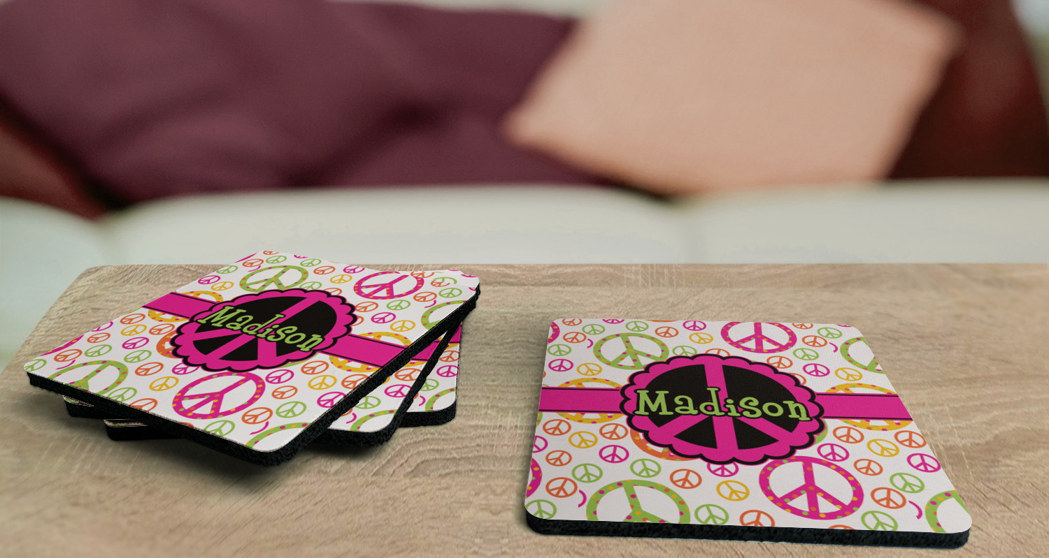 These drink coasters have a smooth, polyester top and a textured, rubber backing on its bottom. The non-slip rubber backing underneath works to keep any spills at bay. At 4 by 4 by 0.25 inches thick, these custom coasters are a suitable size for most drinkware. Your personalization is displayed atop the face of the cup coaster. We sell these rubber coasters in two different shapes: square and round. You can buy each shape as singulars or as a set of 4.