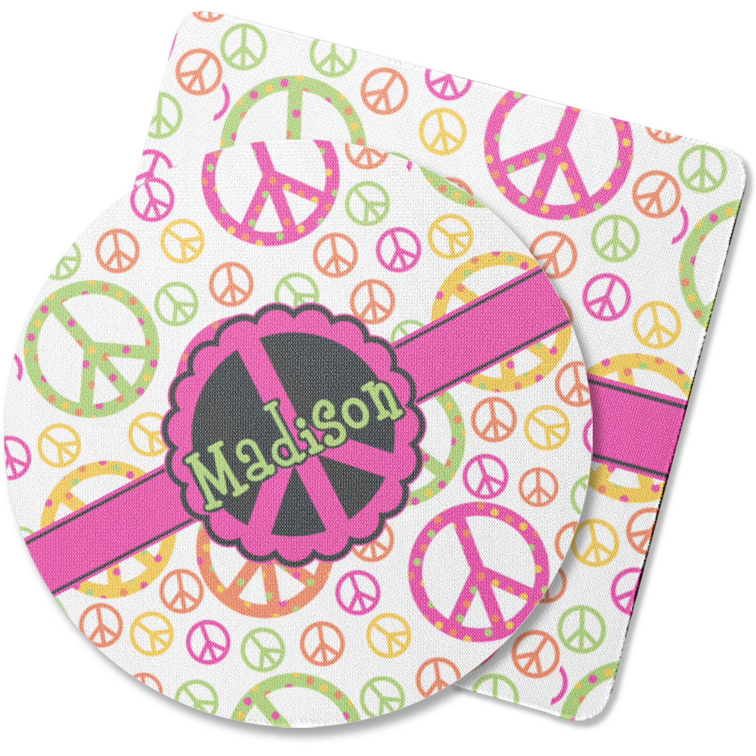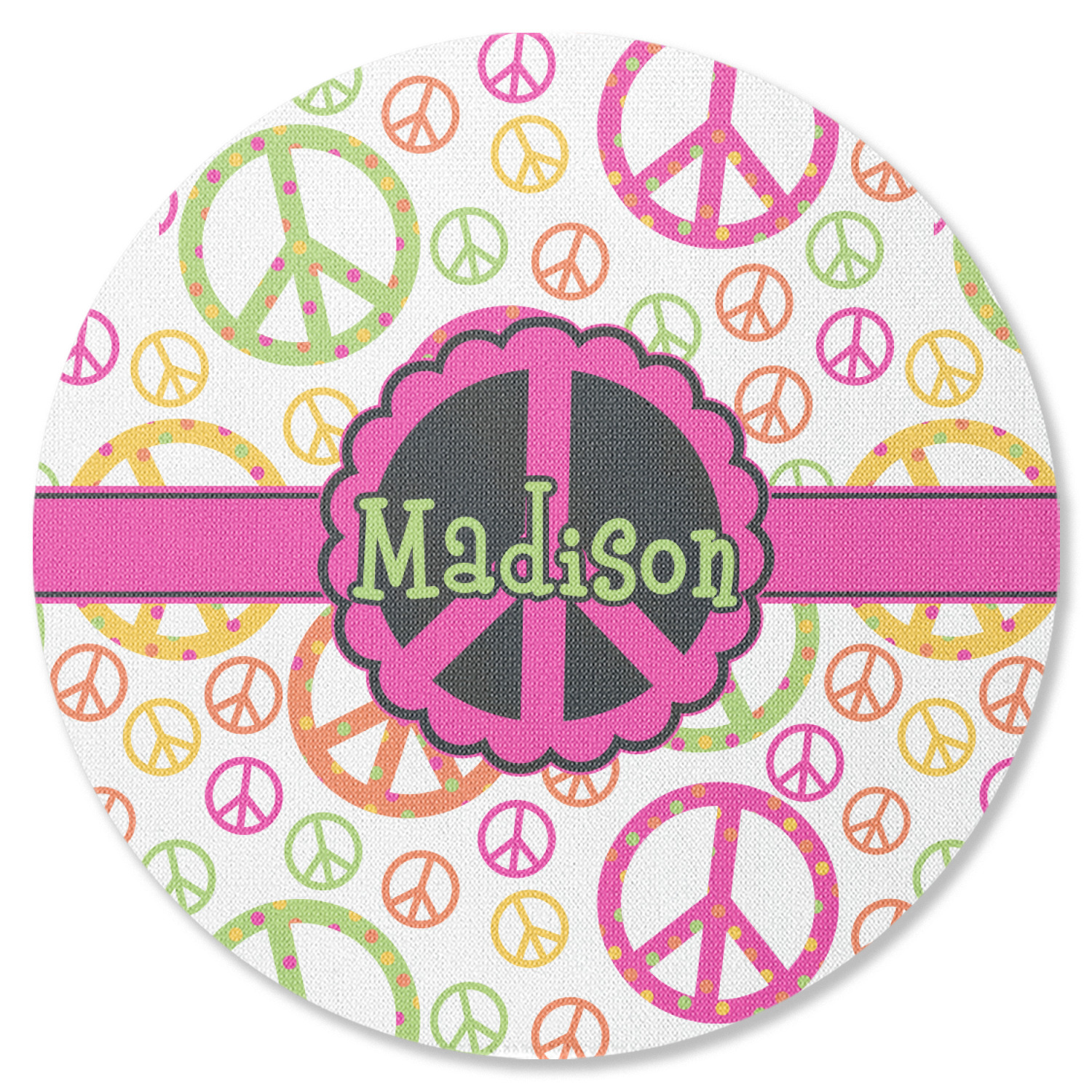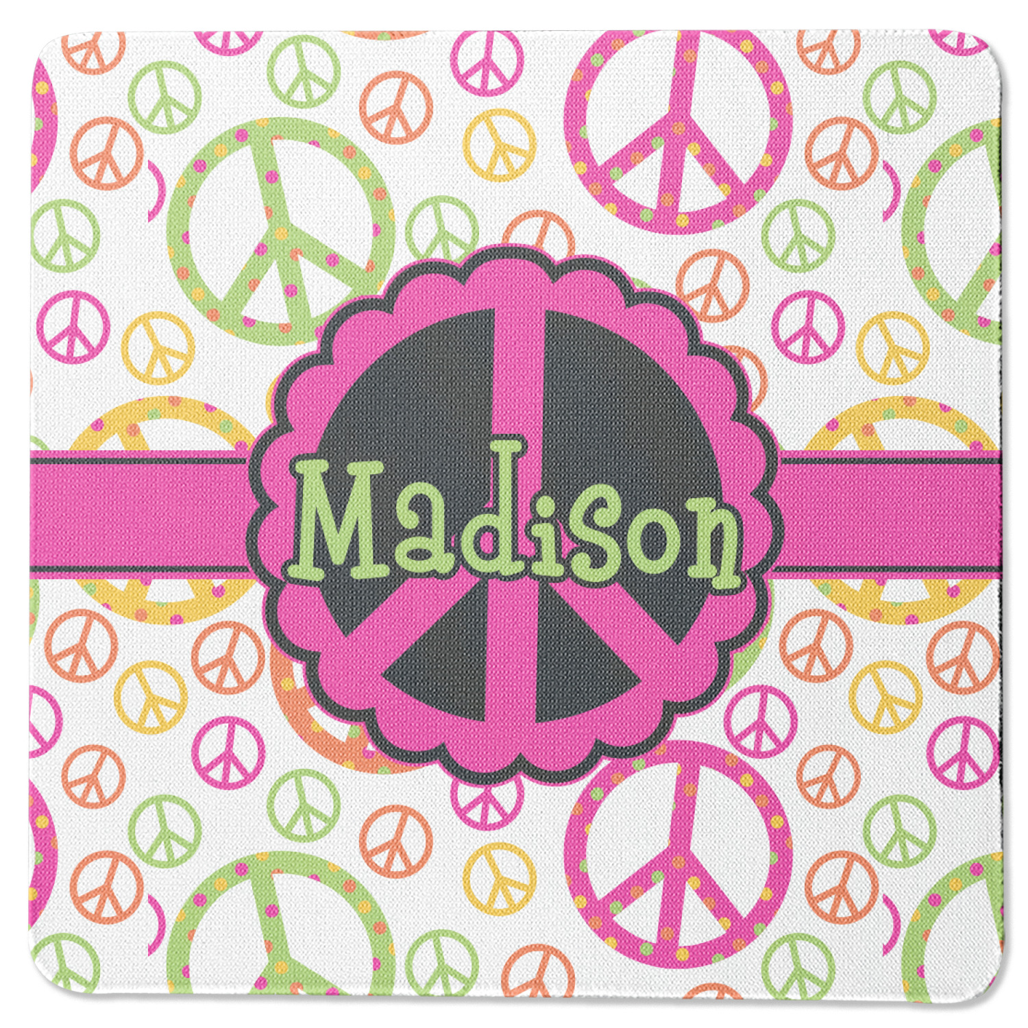 This design is totally groovy and will let the little hippie chick in you shine. Our peace sign design is simply adorable and has beautiful vibrant colors of pink, orange, lime green and yellow. The larger peace signs have fun polka dots and are surrounded by smaller solid colored peace signs.