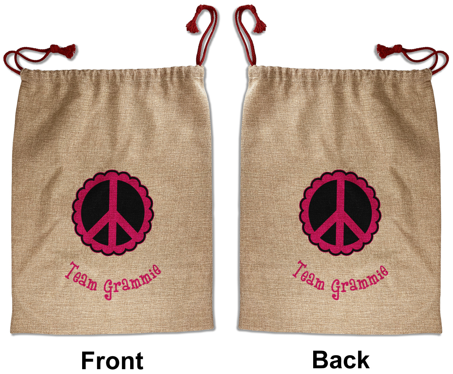 Our Santa sacks print your design on the burlap material giving it a nice rustic, natural design! The burlap material is also machine washable and wrinkle-free, so feel free to fold and store out Santa bags until the next time you need it! Secure your gifts with our red accent drawstring ties at the top of the sack so the mystery of your gift stays a surprise until Christmas day. We offer two types of printing- one side partial print or double-sided partial printing. Design and personalize your own Santa sack in time for the holidays!