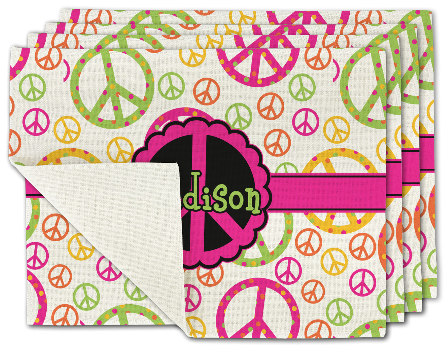 This design is totally groovy and will let the little hippie chick in you shine. Our peace sign design is simply adorable and has beautiful vibrant colors of pink, orange, lime green and yellow. The larger peace signs have fun polka dots and are surrounded by smaller solid colored peace signs.