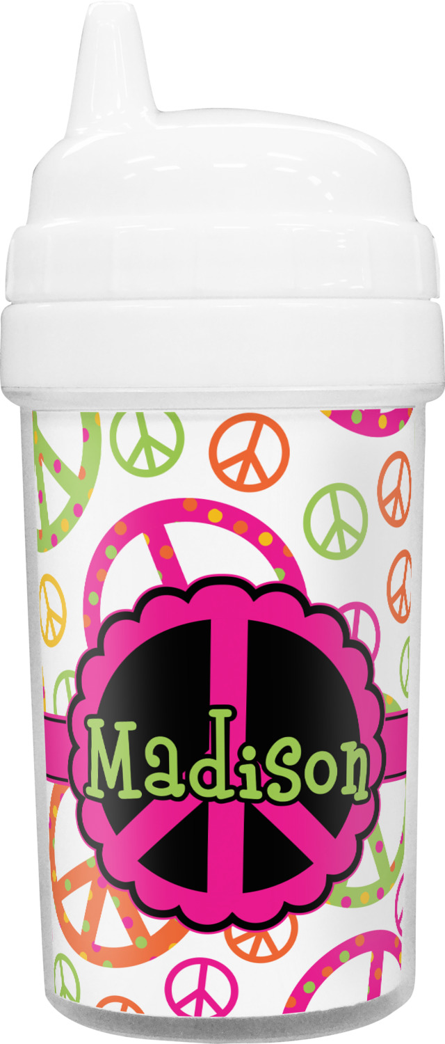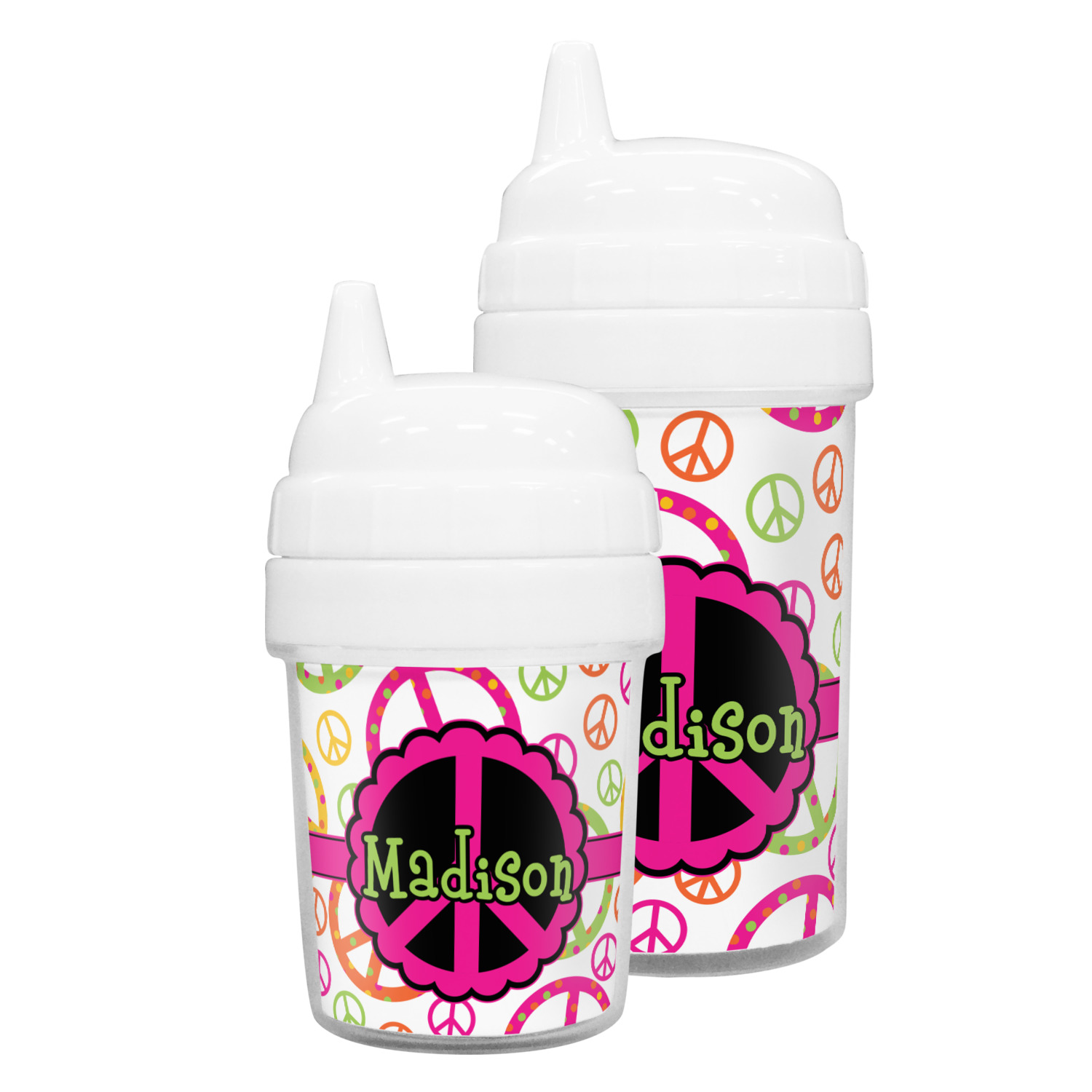 Our toddler cups are free of BPA, and have a twist-open lid so that you can easily fill and clean these cups for your young ones. Each cup also comes with a sippy nozzle to reduce spills. We offer these custom sippy cups in two different sizes; we have a baby sippy cup that holds 5 ounces, and a toddler sippy cup that holds 10 ounces. Your customization is printed on a premium glossy media insert that is placed within these toddler drinking cups.