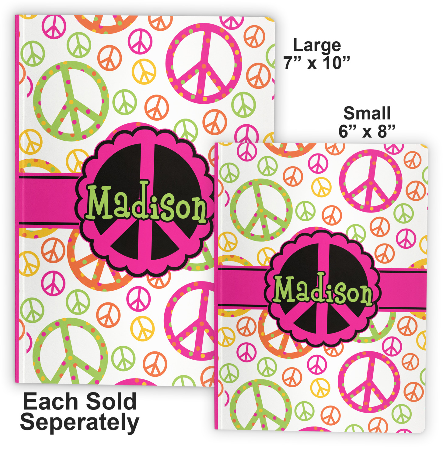 We offer these notebooks in two different sizes. The small notebook is 8" x 5.75", and fits snugly in purses or totes. The large notebook measures at 10" x 7.25", and can be carried in briefcases and backpacks.