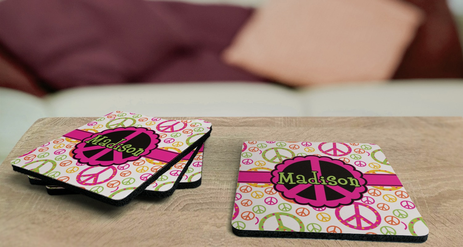 These drink coasters have a smooth, polyester top and a textured, rubber backing on its bottom. The non-slip rubber backing underneath works to keep any spills at bay. At 4 by 4 by 0.25 inches thick, these custom coasters are a suitable size for most drinkware. Your personalization is displayed atop the face of the cup coaster. We sell these rubber coasters in two different shapes: square and round. You can buy each shape as singulars or as a set of 4.