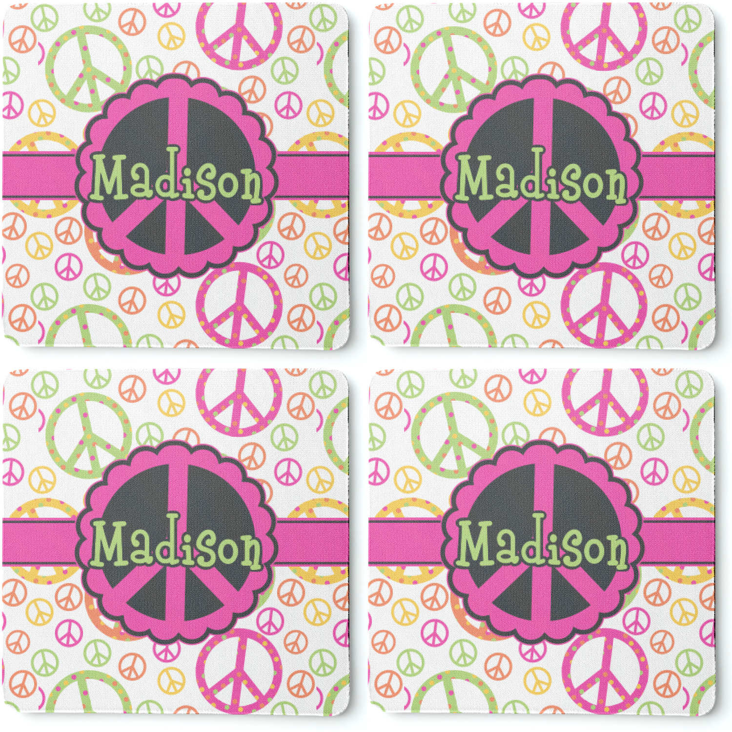 These drink coasters have a smooth, polyester top and a textured, rubber backing on its bottom. The non-slip rubber backing underneath works to keep any spills at bay. At 4 by 4 by 0.25 inches thick, these custom coasters are a suitable size for most drinkware. Your personalization is displayed atop the face of the cup coaster. We sell these rubber coasters in two different shapes: square and round. You can buy each shape as singulars or as a set of 4.