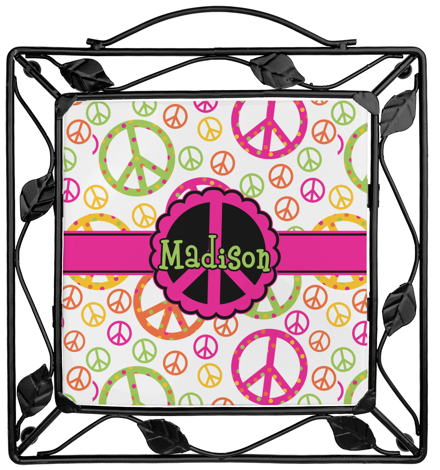 Our square trivets are made from a durable, wrought iron. This model features 4 small half circles, one on each corner, and a larger ring of iron that circles the central, customized tile. Each of the 4 corners has a round foot on its bottom for stability. This trivet is 8.75 by 8.75 inches, but the central tile measures at 6 inches on both sides.